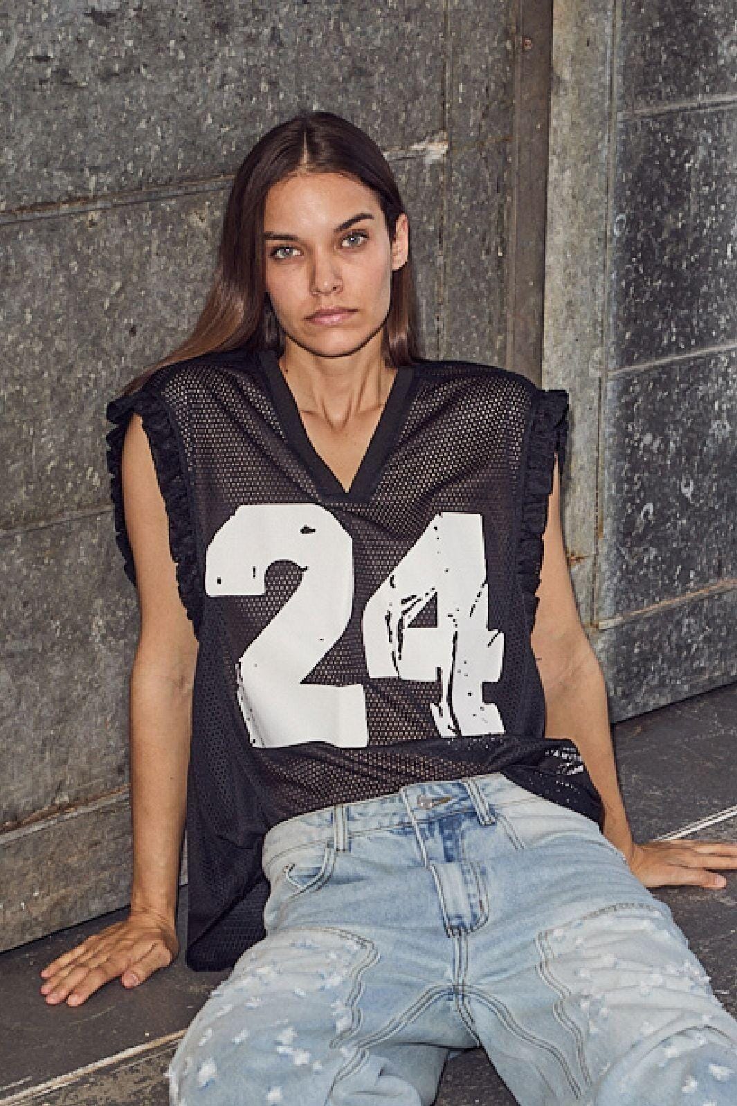 Schwarzes Top von Haute L'Amitié mit Netzstruktur und weißem 24-Print auf der Vorderseite. Das Top hat einen V-Ausschnitt und Rüschen-Details an den Schultern.