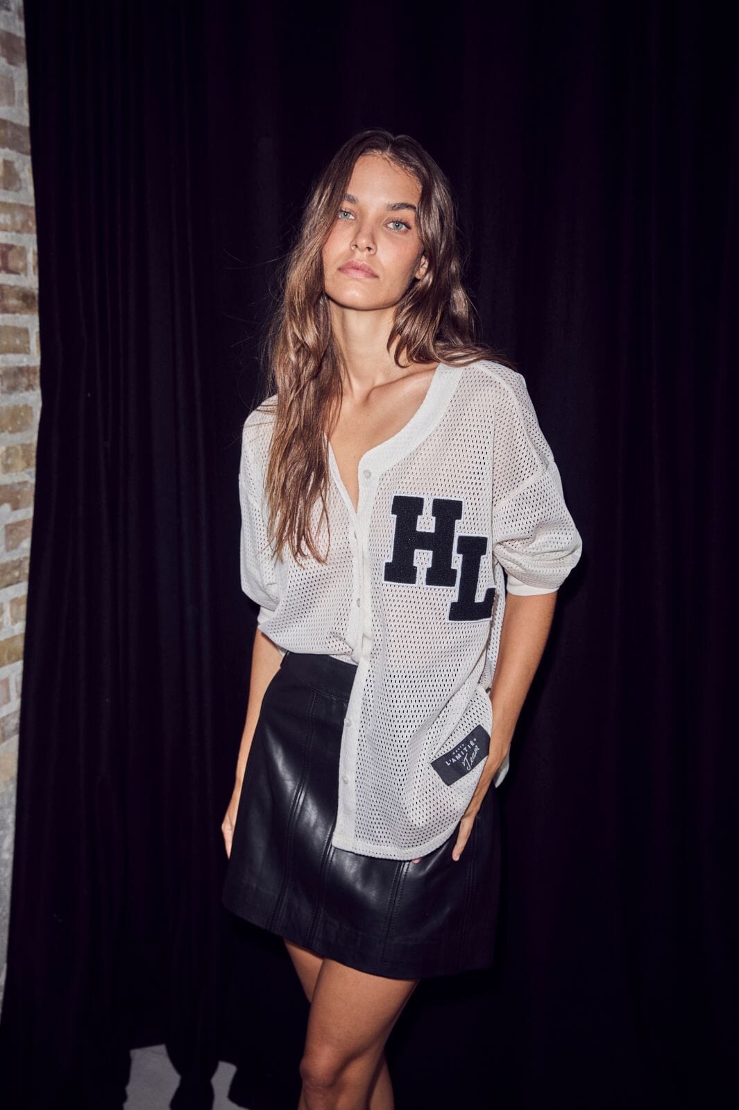 Bluse von Haute L'Amitié in einem weißen perlmuttfarbenen Ton. Die Bluse besteht aus einem meshähnlichen Stoff mit schwarzen HL-Buchstaben auf der linken Brust.