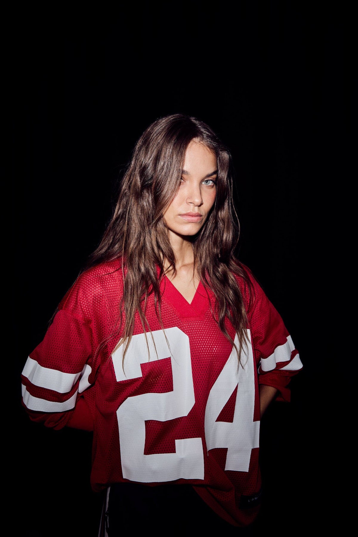 Rotes langärmliges T-Shirt von Haute L'Amitié aus Mesh-Stoff mit großer weißer Nummer 24 auf der Vorderseite und zwei weißen Streifen an den Ärmeln.