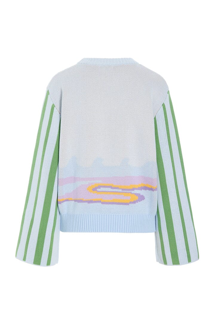 Bluse von Hunkøn in der Farbe Blue Sea. Sie hat ein gesticktes Motiv mit Sonne und Boot auf der Vorderseite und vertikale Streifen an den Ärmeln.