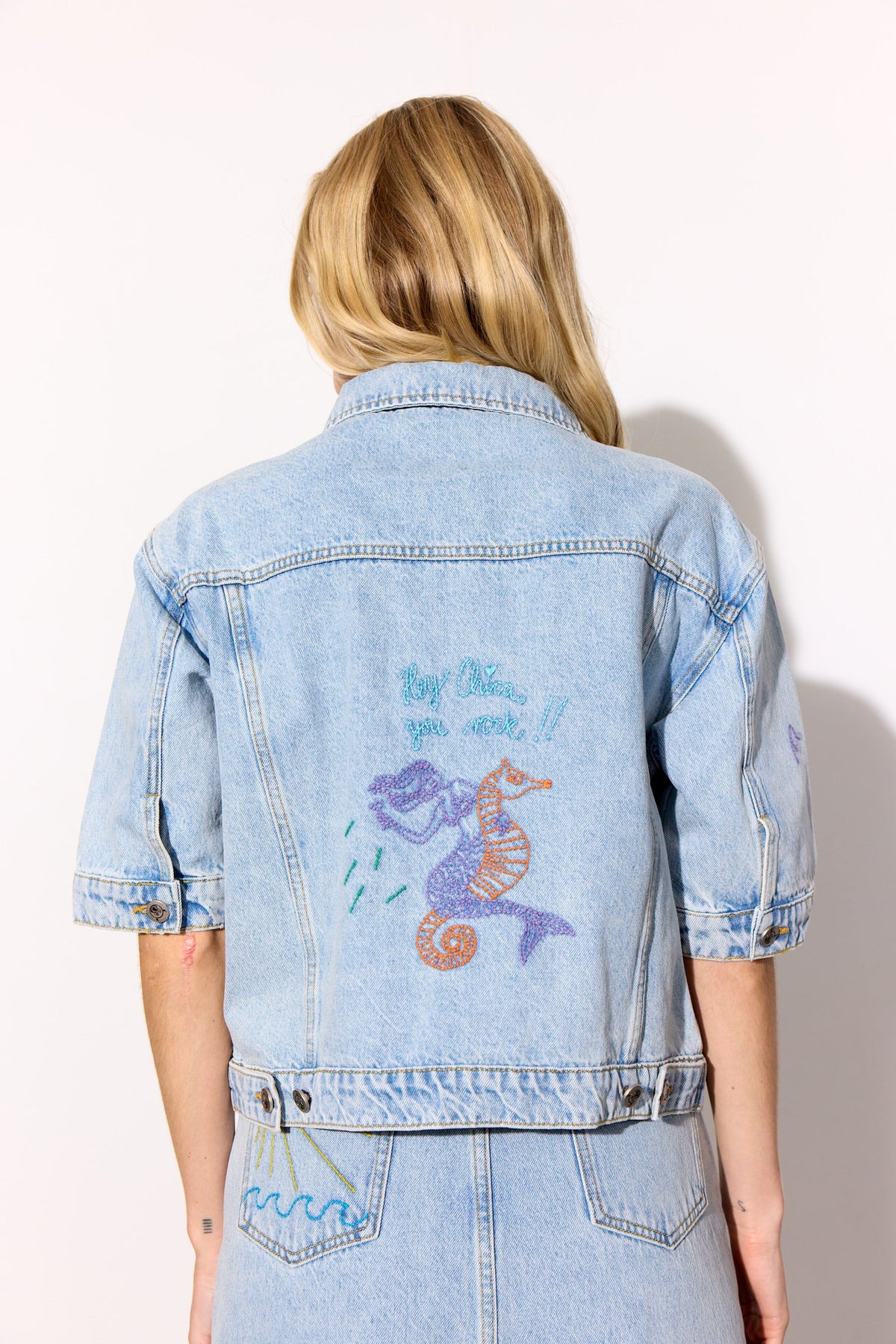 Jeansjacke von Hunkøn aus hellblauem Denim mit gestickten Motiven und Wellen auf der Vorder- und Rückseite. Die Jacke hat eine lockere Passform und kurze Ärmel.