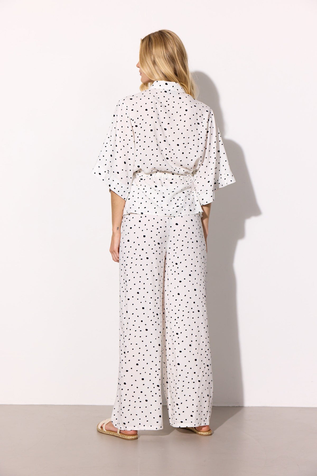 Weiße Hose von Hunkøn mit schwarzen Punkten. Die Hose hat eine lockere Passform und besteht aus weichem Viskosestoff.