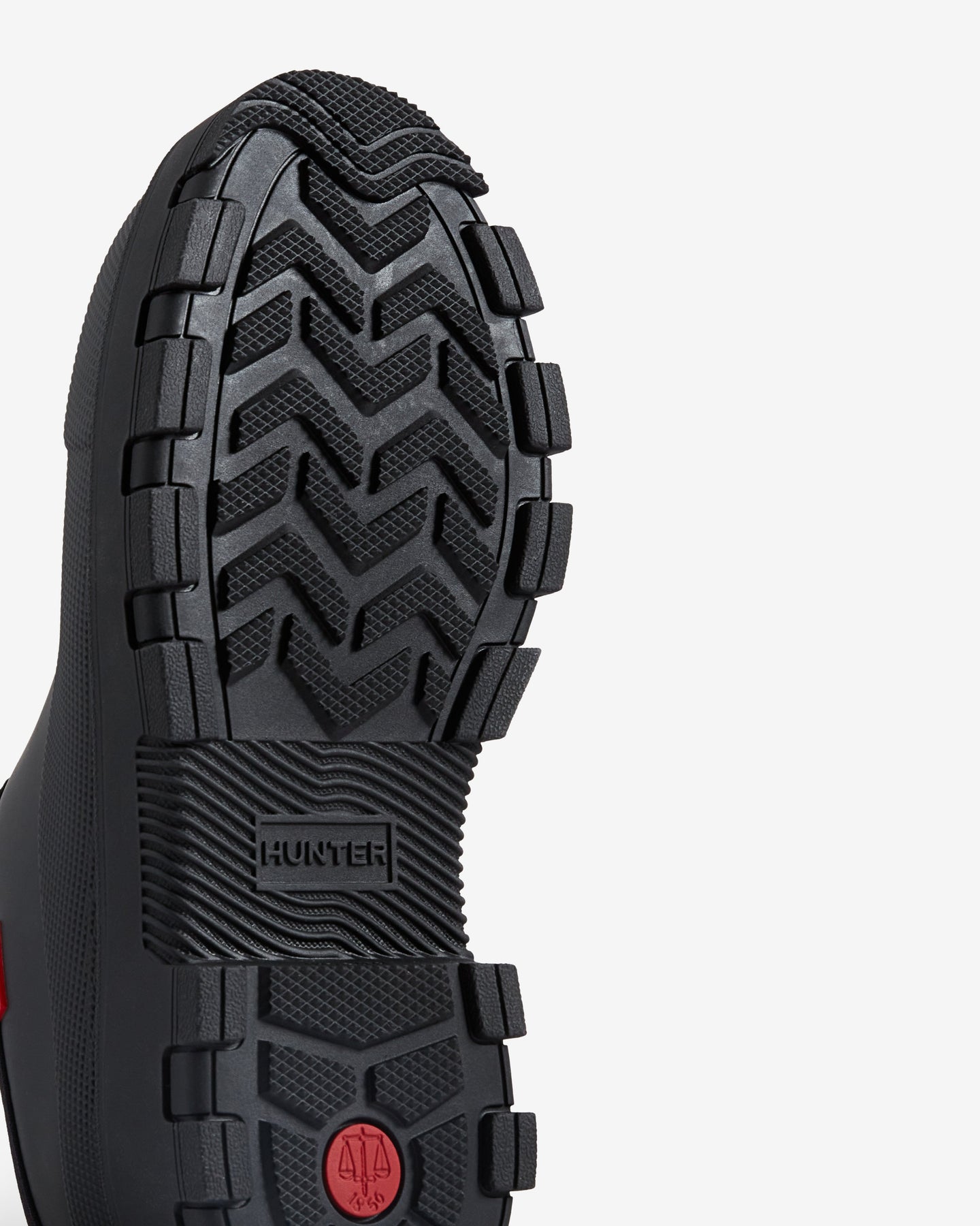 Schwarze Clogs von Hunter, gefertigt aus spritzgegossenem Gummi. Die Clogs haben eine glatte Oberfläche und eine robuste Sohle mit tiefem Profil.