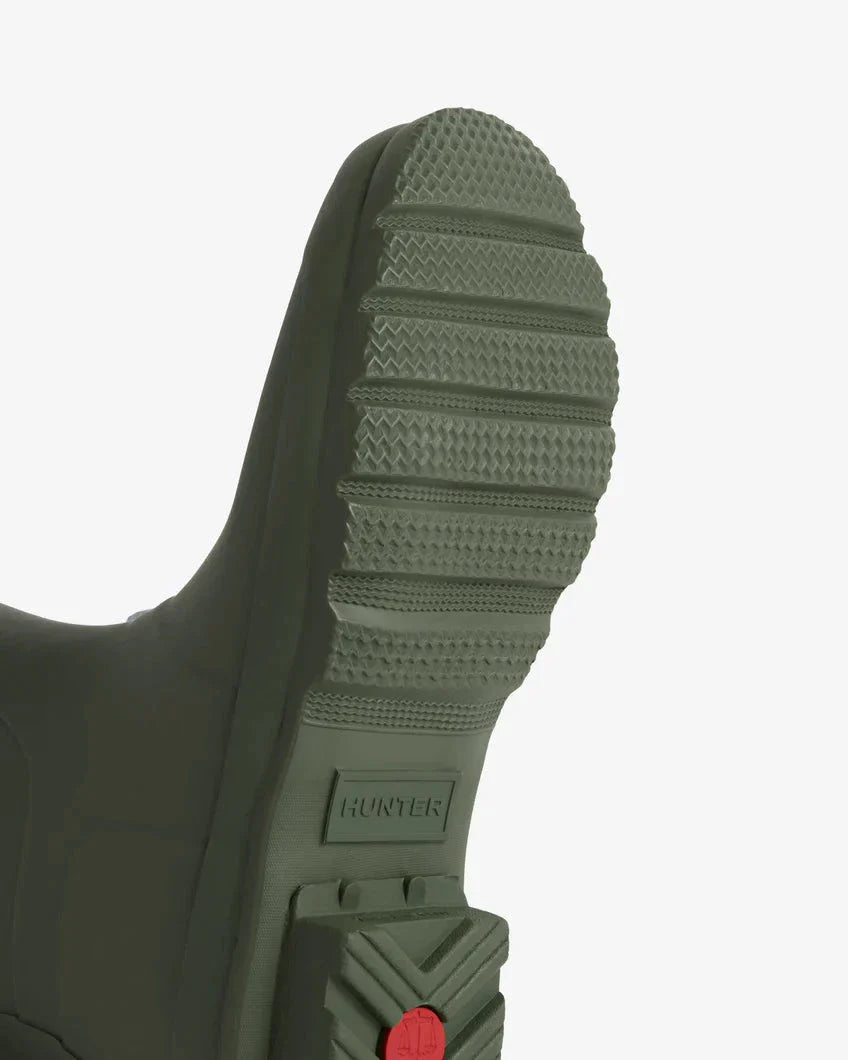 Kurze Stiefel von Hunter in einem dunkelolivgrünen Farbton. Die Stiefel bestehen aus Gummi und haben ein klassisches Design mit dem Hunter-Logo gut sichtbar auf der Vorderseite.