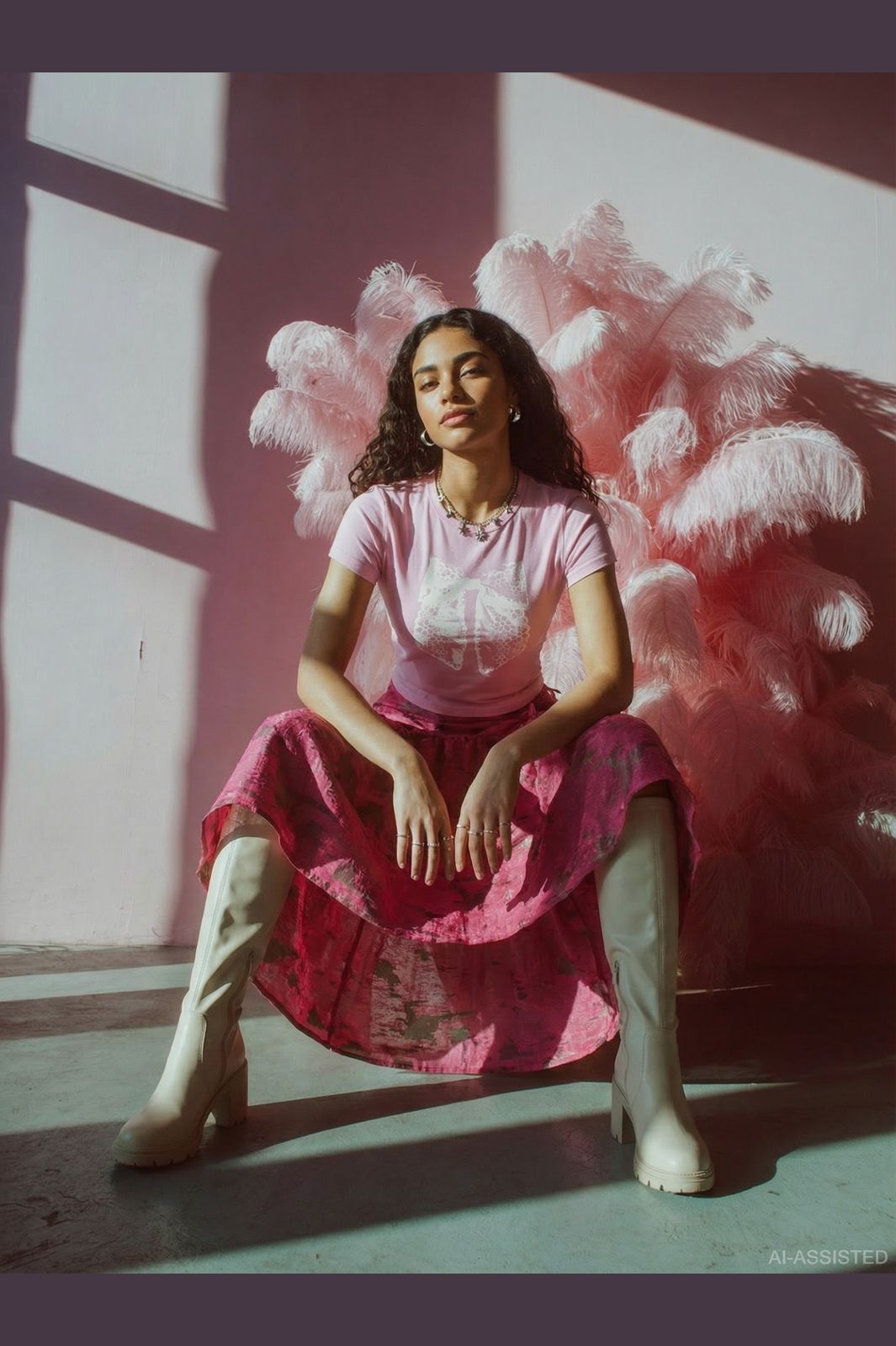 Langer Rock von Hypedrop in Rosa mit Camouflage-Muster in dunkleren Nuancen. Der Rock hat ein Volantdetail am Saum und ein Bindeband an der Seite.