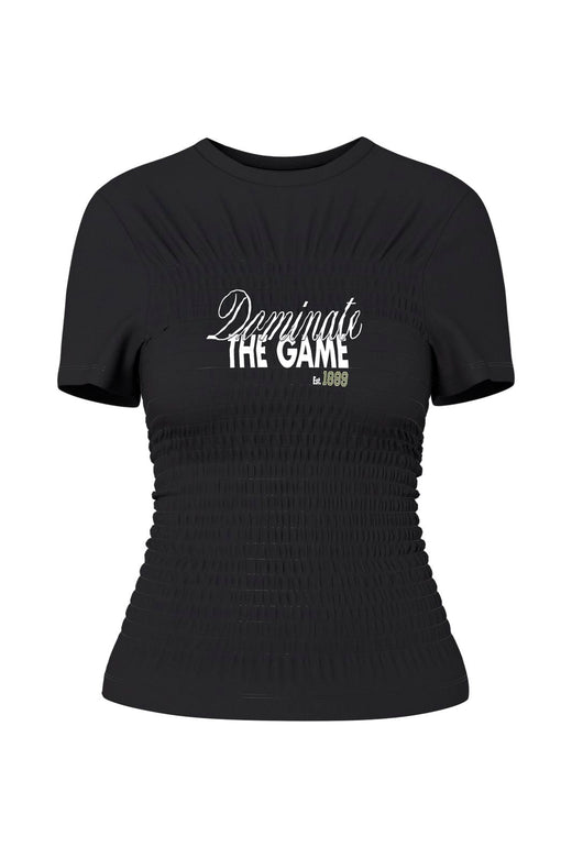 Schwarzes Top von Hypedrop mit einem Schulterdesign und Rüschendetails. Das Top hat einen transparenten Mesh-Ärmel auf einer Seite und eine figurbetonte Passform.