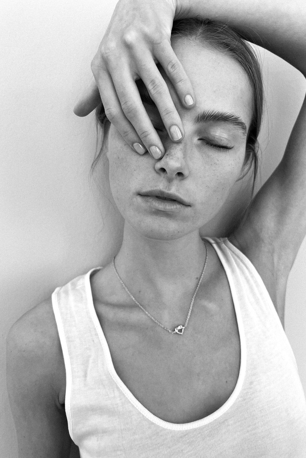 Halskette von Jane Kønig mit einem herzförmigen Anhänger. Der Anhänger hat ein Knotendesign und besteht aus Sterlingsilber mit einer feinen Kette.