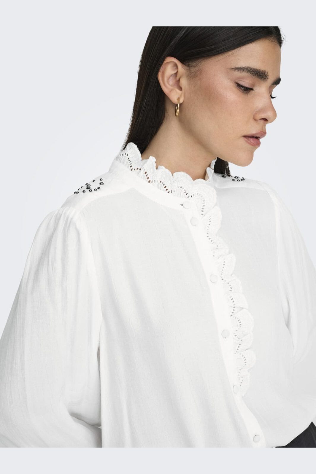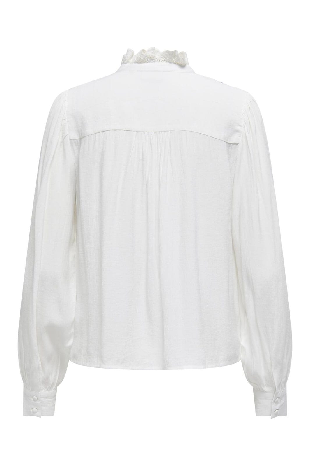 Weiße Bluse von JDY mit Rüschen und Spitzen-Details. Die Bluse hat lange Ärmel mit Volumen und einen klassischen Hemdkragen mit gerafftem Rand. Die Knöpfe vorne machen sie einfach anzuziehen.