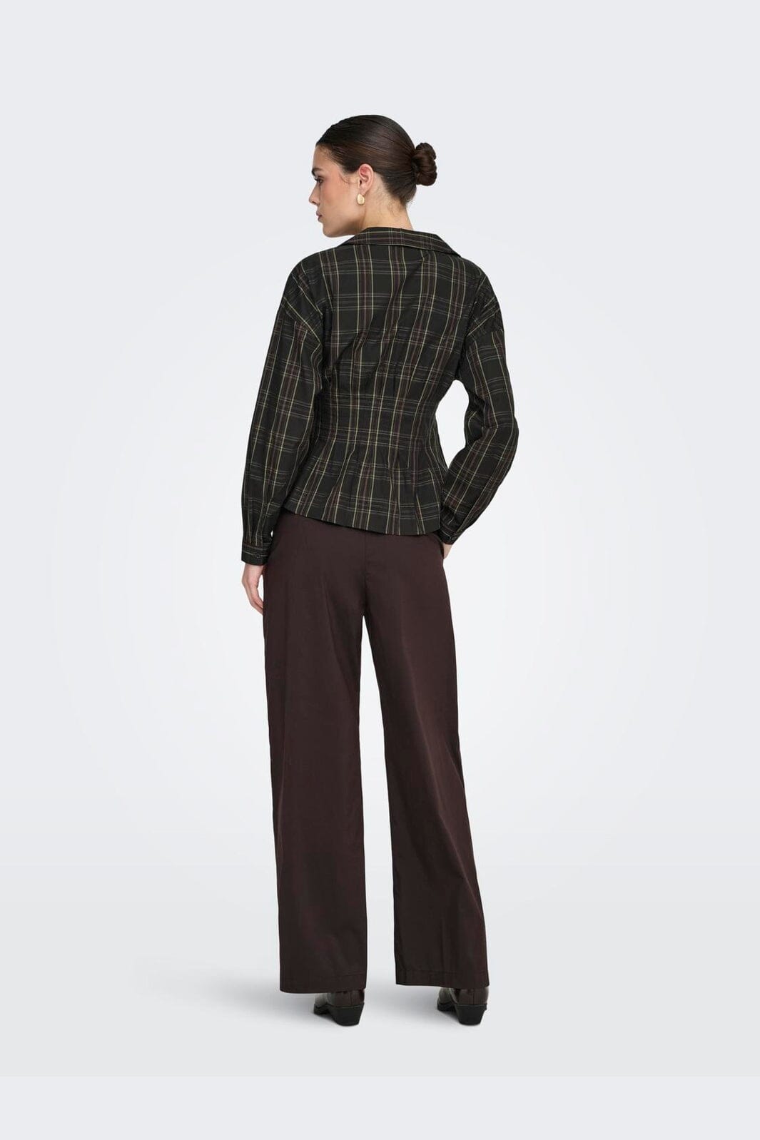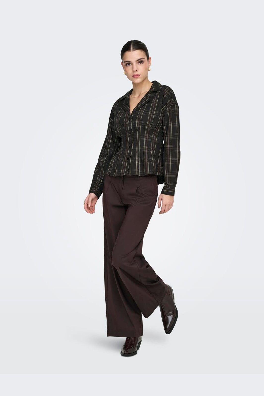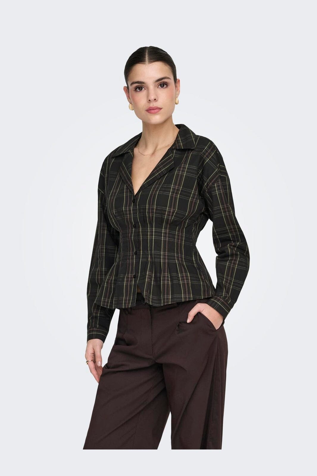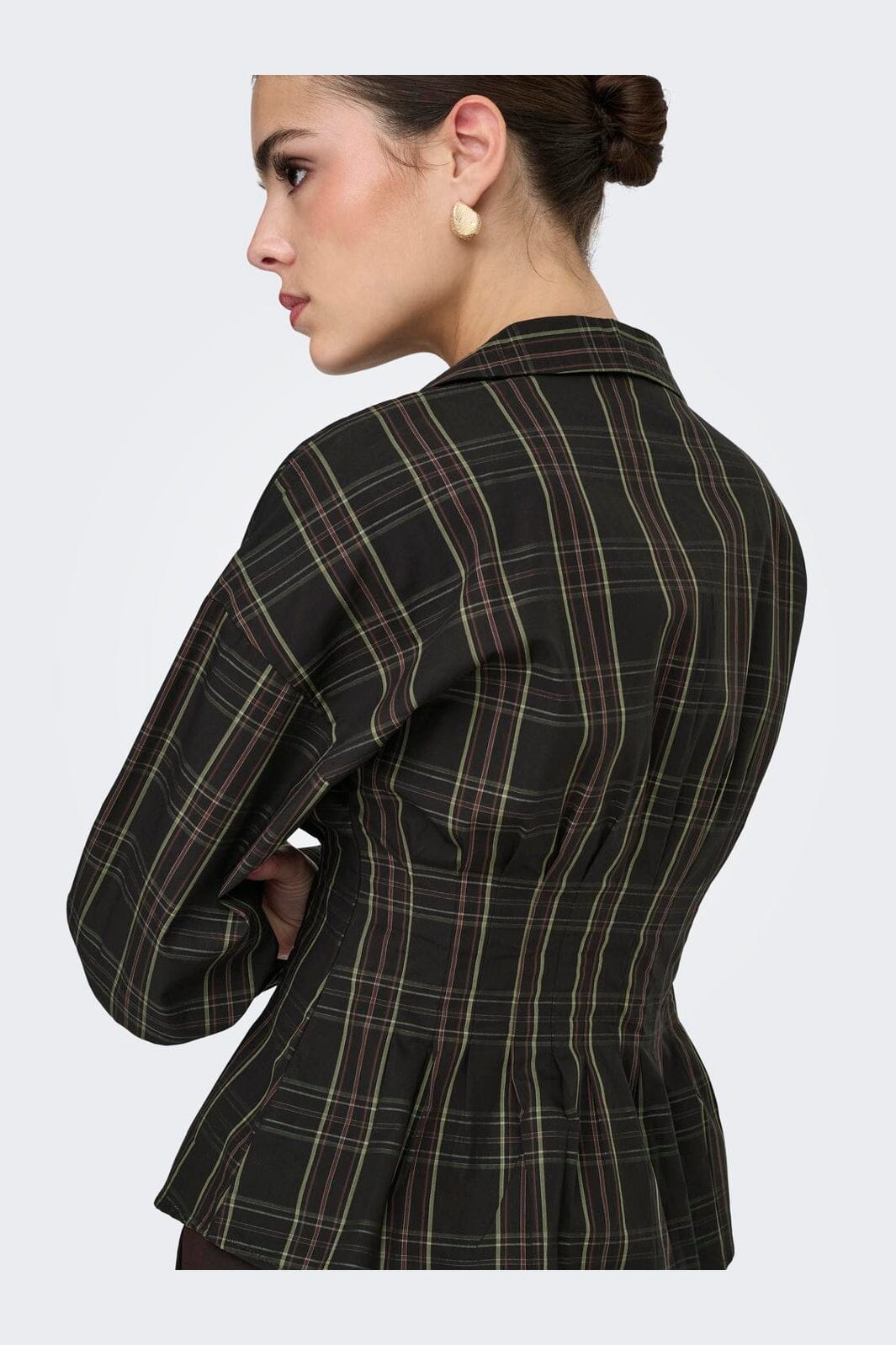 Kariertes Hemd von JDY in Schwarz mit grünem und rotem Karomuster. Das Hemd besteht aus Bio-Baumwolle und hat eine taillierte Passform.