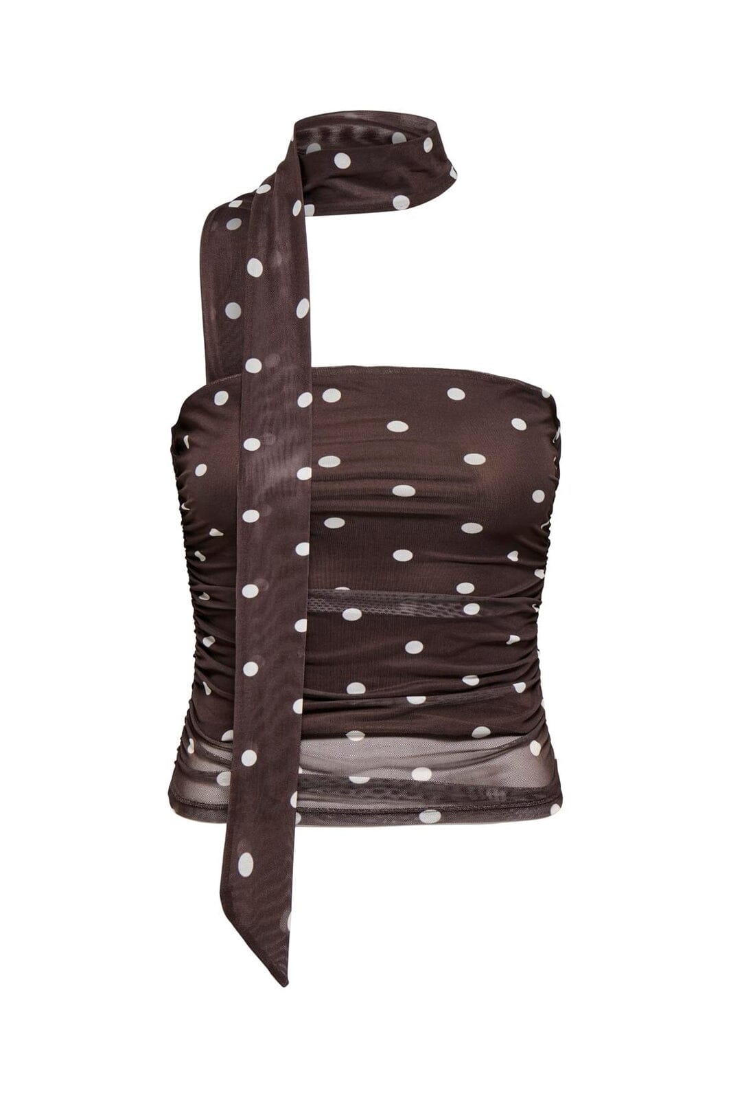 Mesh-Tube-Top von JDY in Braun mit weißen Polka-Dots. Das Top besteht aus einem transparenten Mesh-Stoff mit netzartiger Struktur.