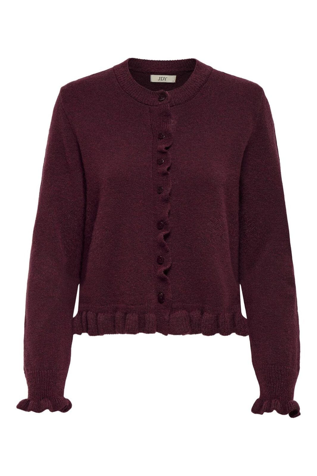 Weinrote Cardigan von JDY in meliertem Strick mit Rüschendetails. Sie hat einen runden Hals, lange Ärmel und Knöpfe entlang der Vorderseite.