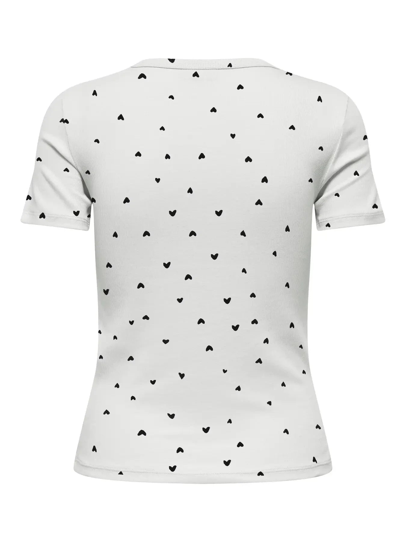 Weißes T-Shirt von JDY mit kleinen schwarzen Herzen. Das Oberteil hat kurze Ärmel und einen Rundhalsausschnitt in einer Slim-Fit-Passform.