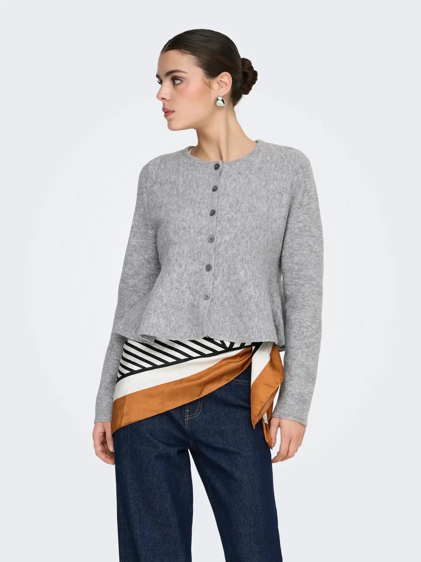 Hellgraue Strick-Cardigan von JDY mit Knopfleiste und Rüschen-Details. Die Cardigan hat lange Ärmel und einen runden Halsausschnitt.