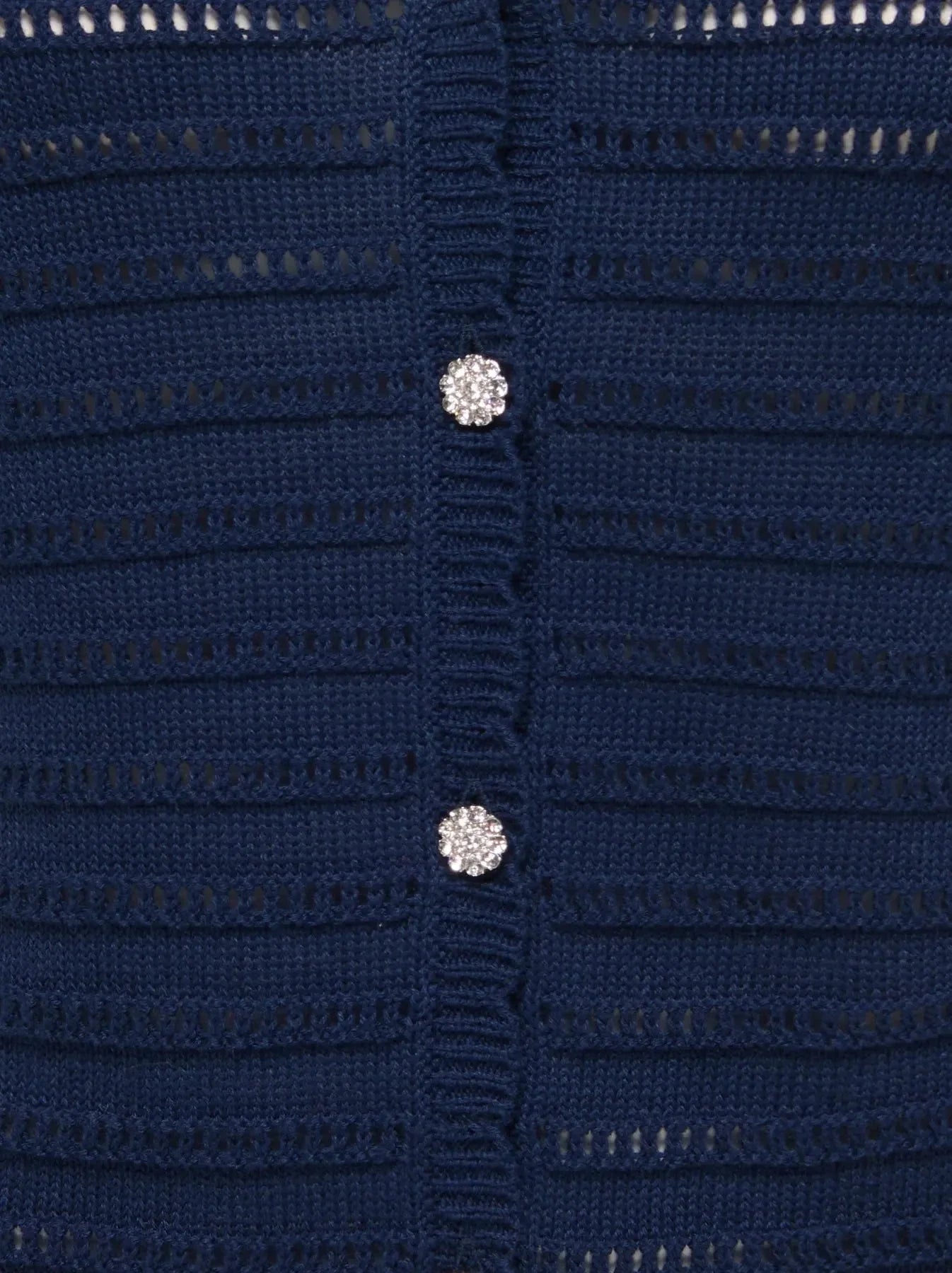 Eine dunkelblaue Strickjacke von JDY mit offen gestricktem Muster und kurzen Ärmeln. Der V-Ausschnitt und die glitzernden Knöpfe verleihen der Strickjacke einen femininen Ausdruck.