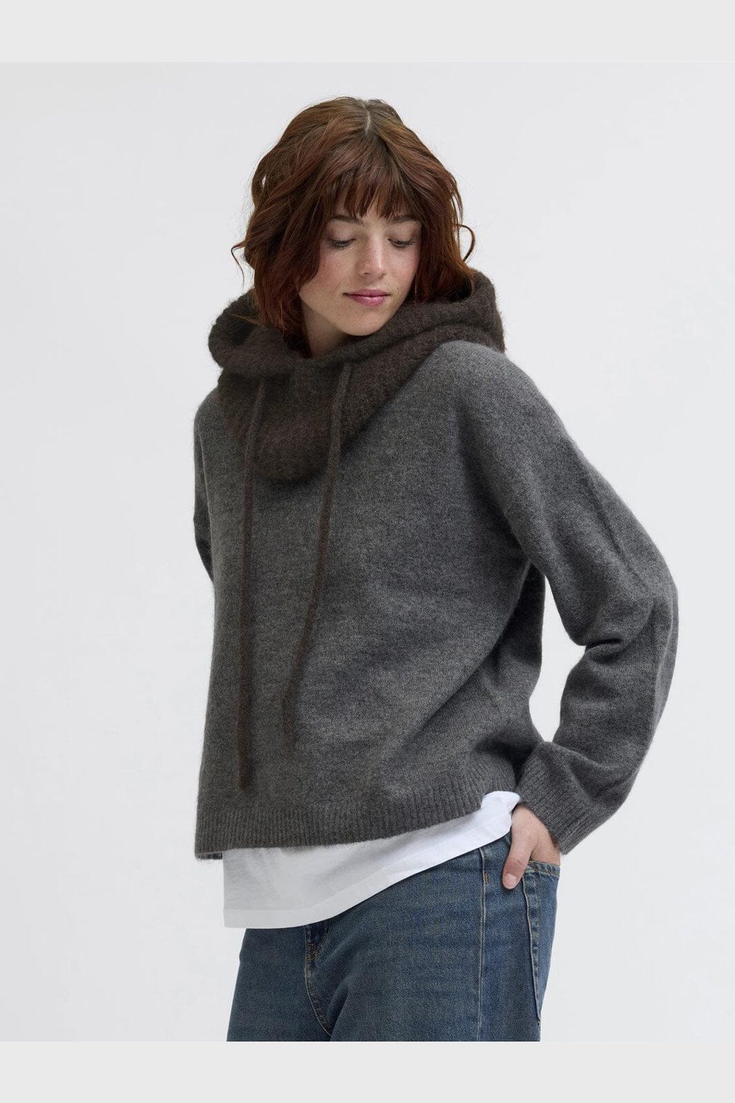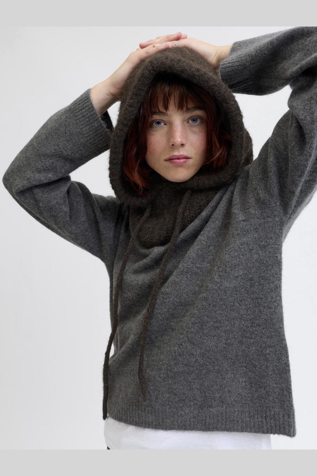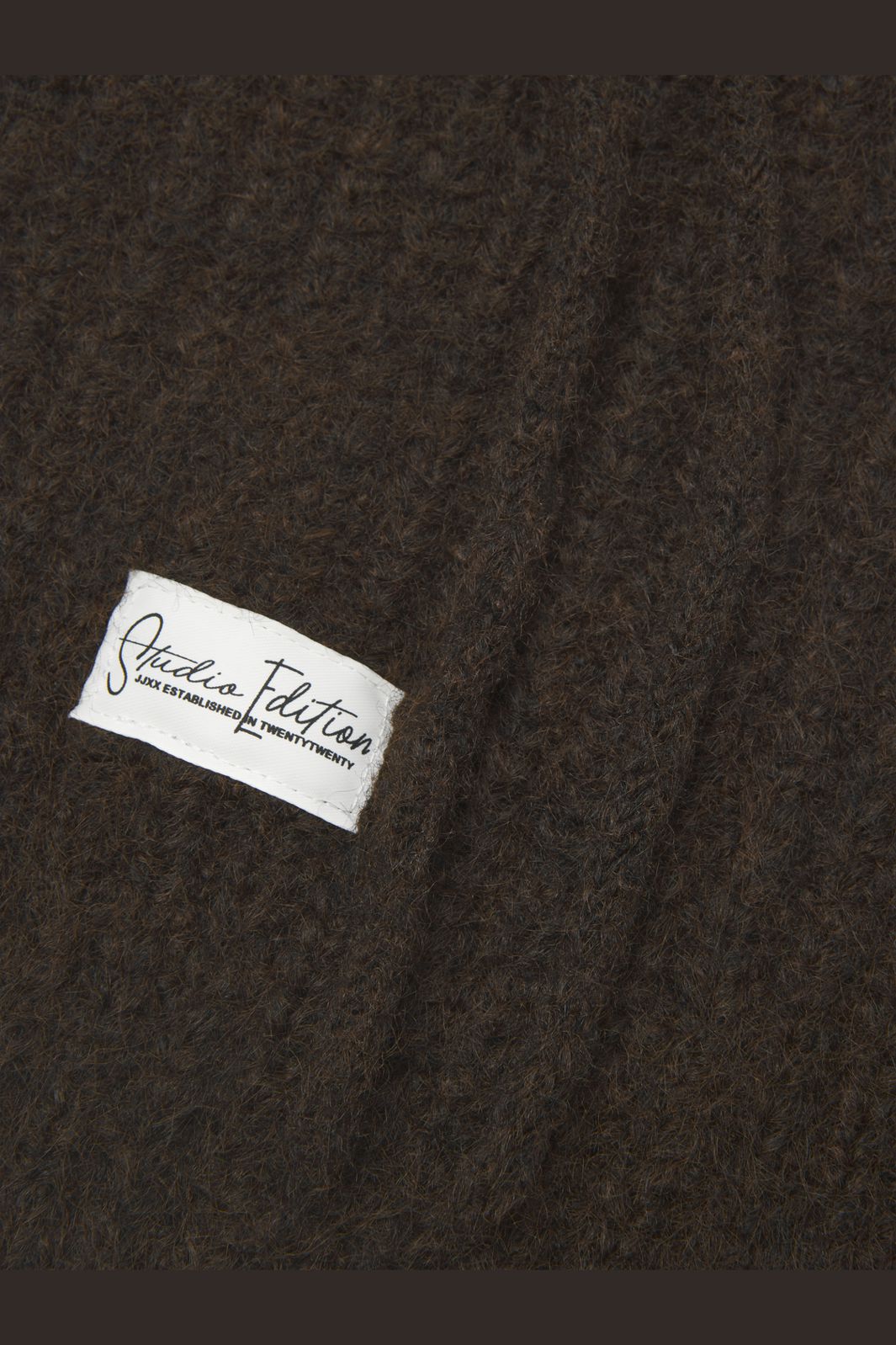 Braune Balaclava von JJXX aus Flachstrick mit Schnürverschluss. Sie hat ein Badge-Detail und besteht aus einer Mischung aus recyceltem Polyester und Wolle, die an kalten Tagen Wärme bietet.