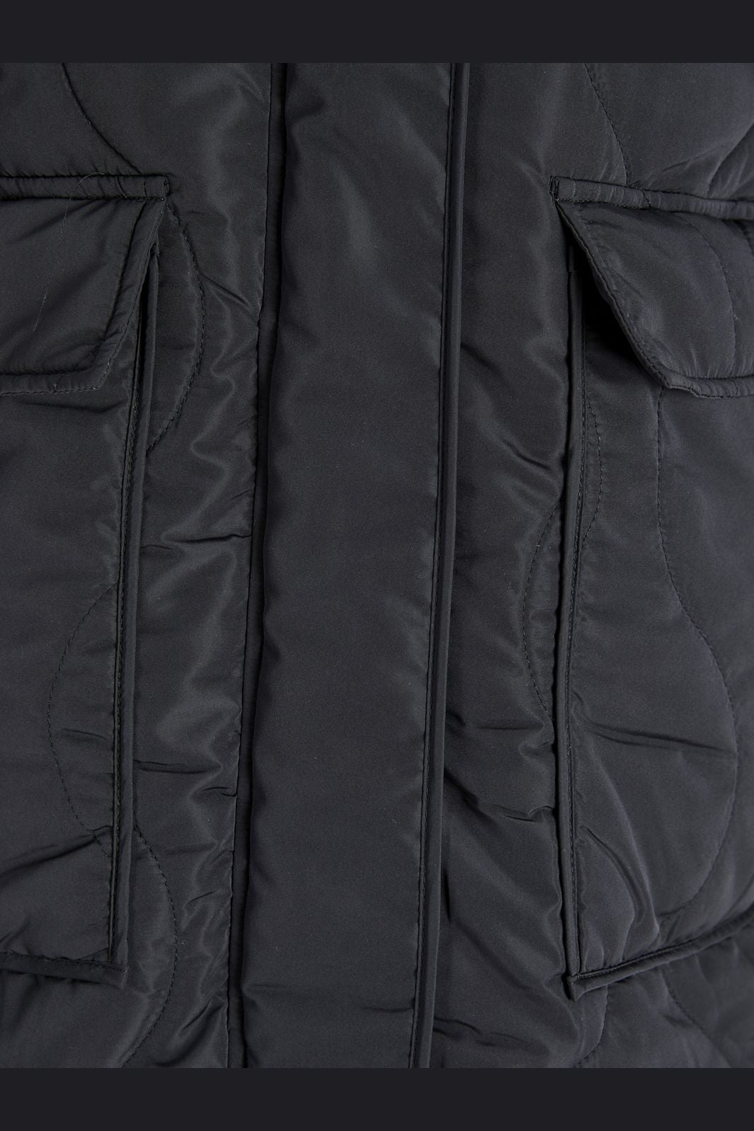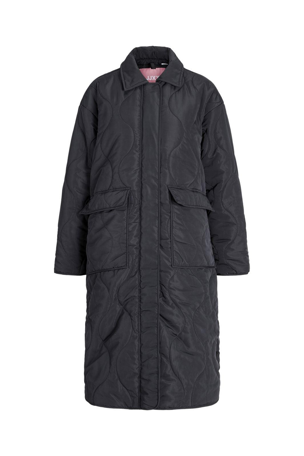 Schwarzer gesteppter Mantel von Jjxx mit langer Passform und sichtbaren Nähten. Der Mantel hat einen Kragen, zwei Vordertaschen und einen versteckten Reißverschluss an der Seite.