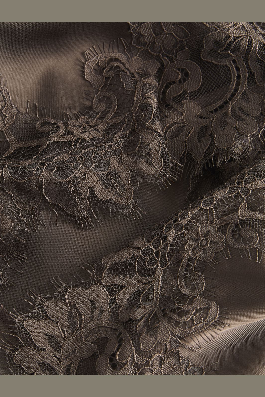 Asymmetrischer Satinstock von Jjxx in einem dunkelbraunen Farbton. Der Rock hat eine glänzende Oberfläche und einen asymmetrischen Saum mit Spitzendetails.