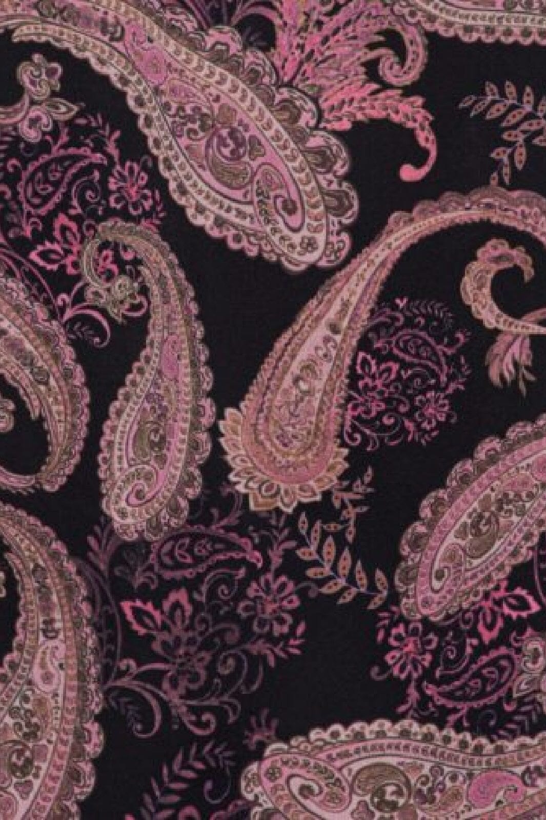 Hochgeschlossene Bluse von Karmamia mit Paisleymuster in rosa Nuancen auf schwarzem Hintergrund. Die Bluse hat ein Halterneck-Design mit hohem Kragen und Bindebändern im Nacken.