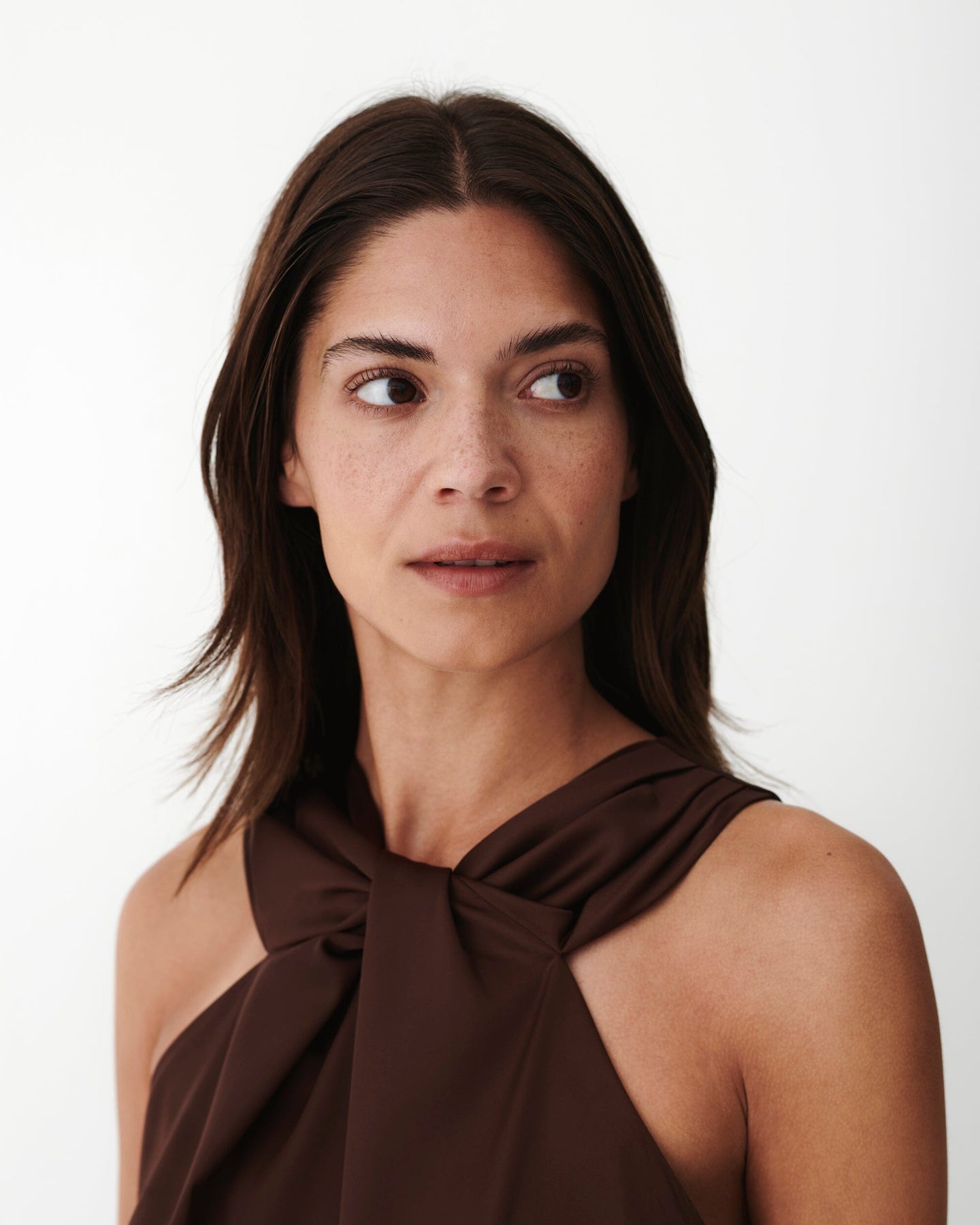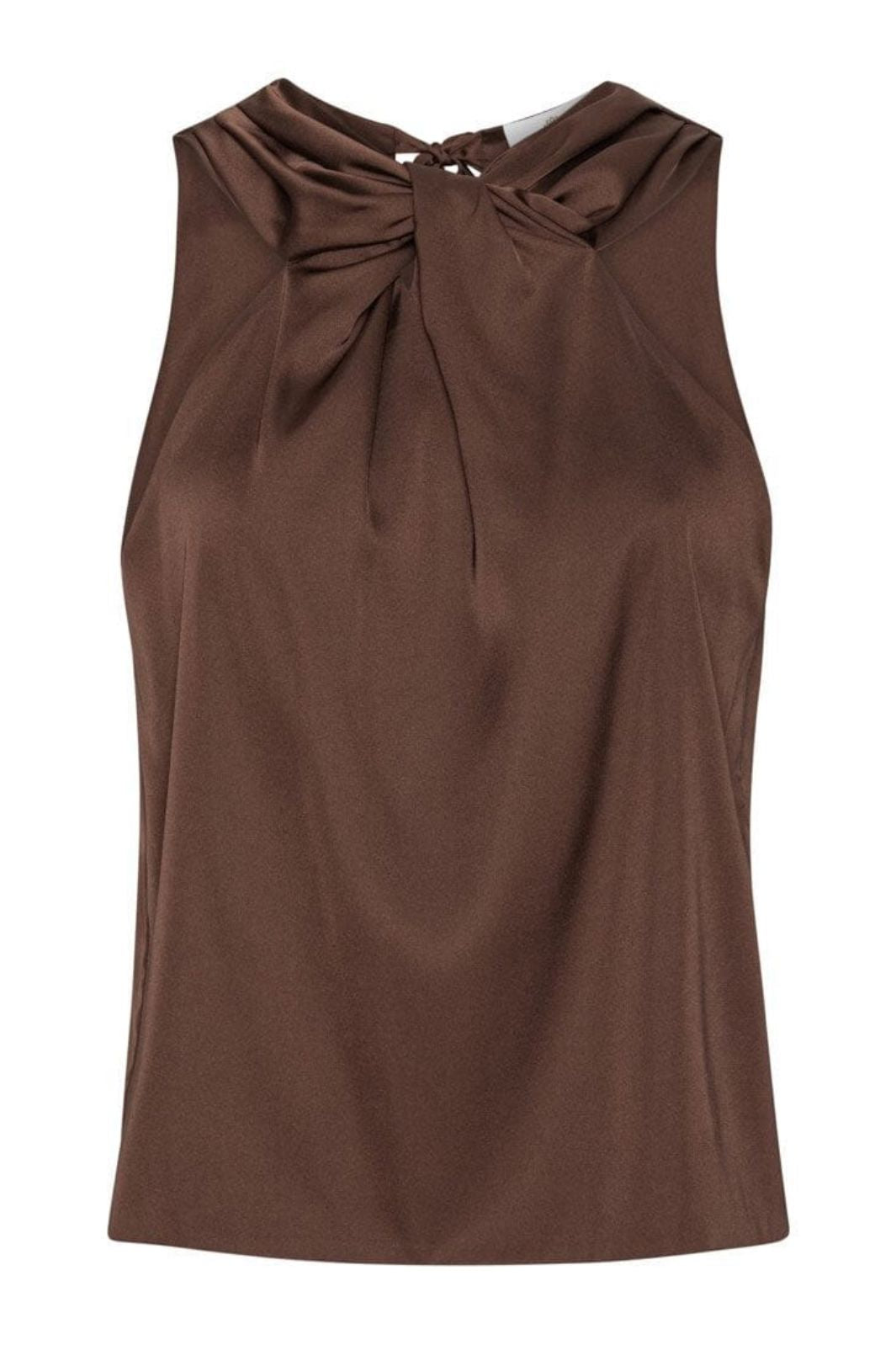 Brauner Top von Karmamia mit hohem Kragen und Knotendetail. Das ärmellose Modell hat eine reguläre Passform und wird mit Knöpfen geschlossen. Der Top passt sowohl zu formellen als auch zu festlichen Anlässen.
