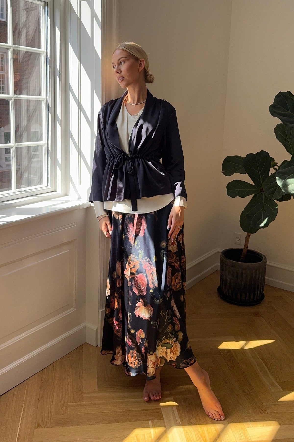 Schwarzer Rock von Karmamia mit Blumenmuster in Pink, Pfirsich und Creme. Er hat eine hohe Taille und reicht bis zur Mitte der Wade. Der Stoff fällt weich und hat eine glatte Oberfläche.