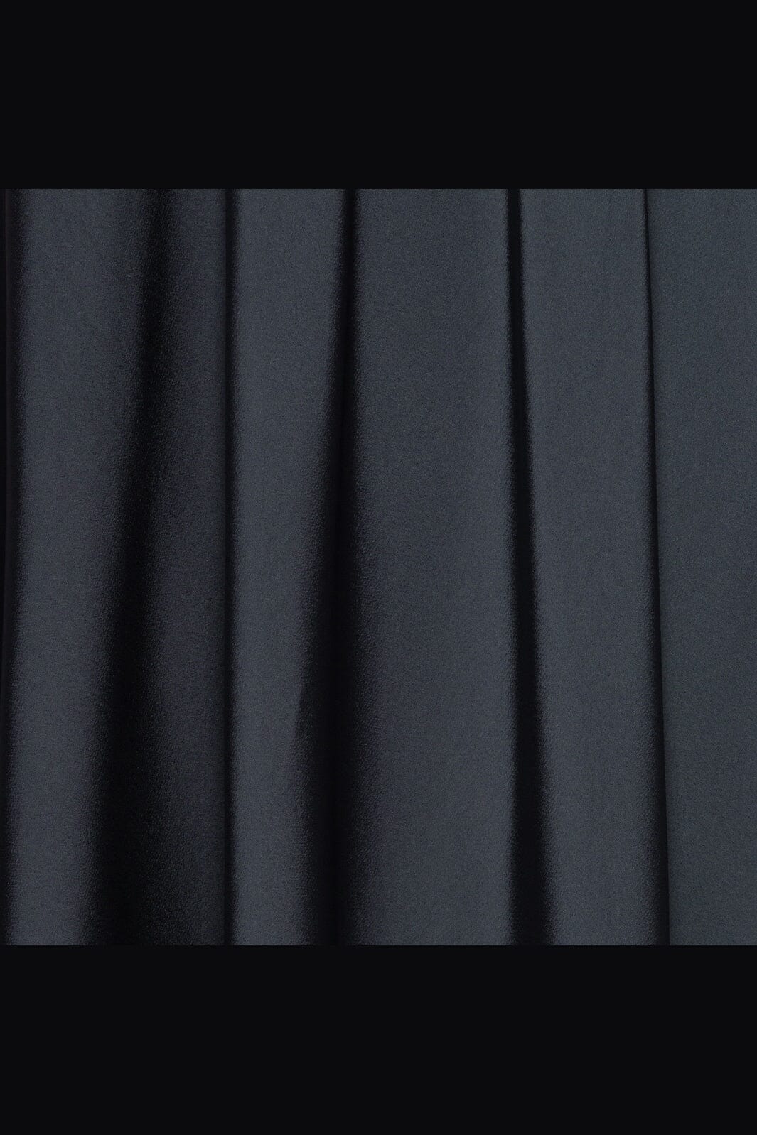 Dunkelblaue Rock von Karmamia aus glänzendem Satin. Er hat eine hohe Taille mit gerafftem Gummibund und fällt locker bis zur Wade mit sanften Falten.