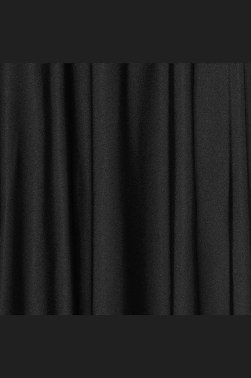 Schwarzer Rock von Karmamia aus halbglänzendem Satin. Er hat eine hohe Taille mit Rüschen und dekorativen Nähten. Der Rock reicht bis zur Mitte der Wade und hat eine lockere Passform.