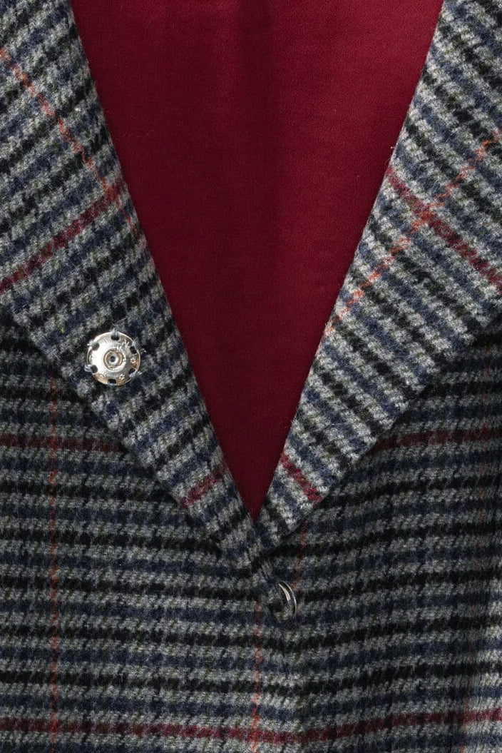 Spencer-Jacke von Karmamia mit kariertem Muster in Schwarz, Grau, Rot, Bordeaux und Silber. Die Jacke hat Peplumärmel mit geschichteten Rüschen und ein rotes Futter.