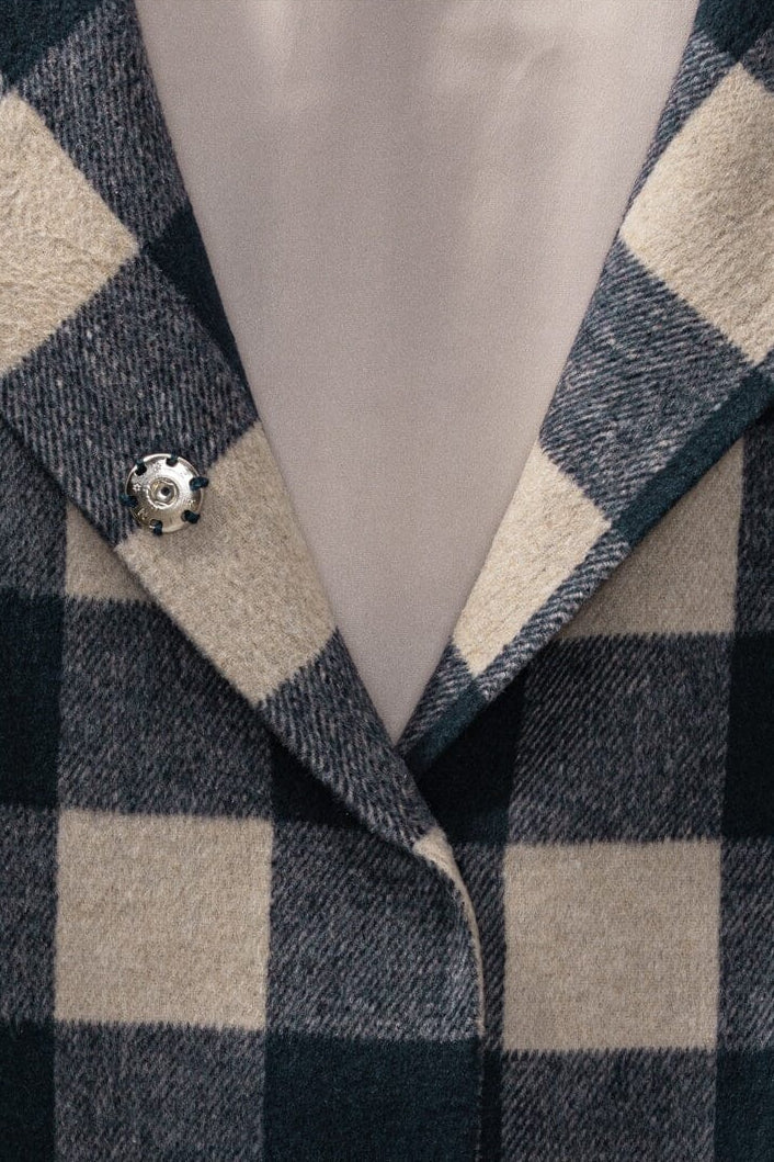 Spencerjacke von Karmamia mit kariertem Muster in Beige und Dunkelblau. Die Jacke hat einen V-Ausschnitt und 3/4-Ärmel mit Rüschendetails.