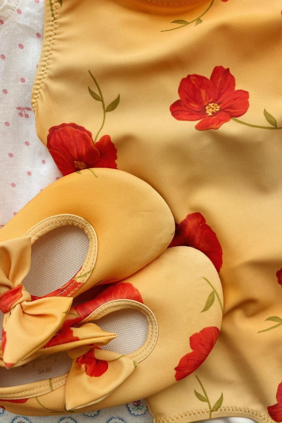 Wasserschuhe von Konges Sløjd in Gelb mit roten Blumen. Die Schuhe haben ein Schleifendetail oben und eine runde Zehenpartie.