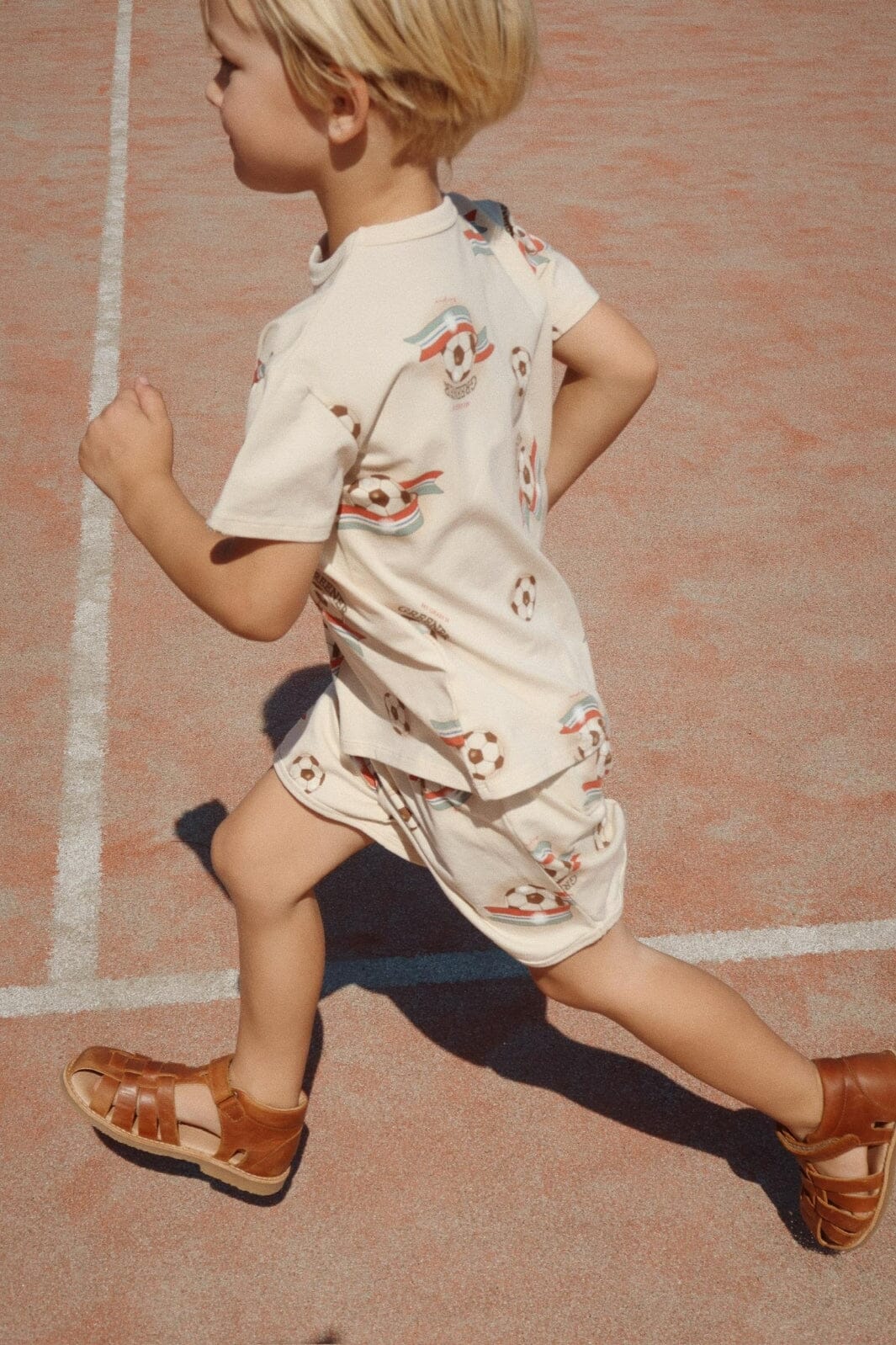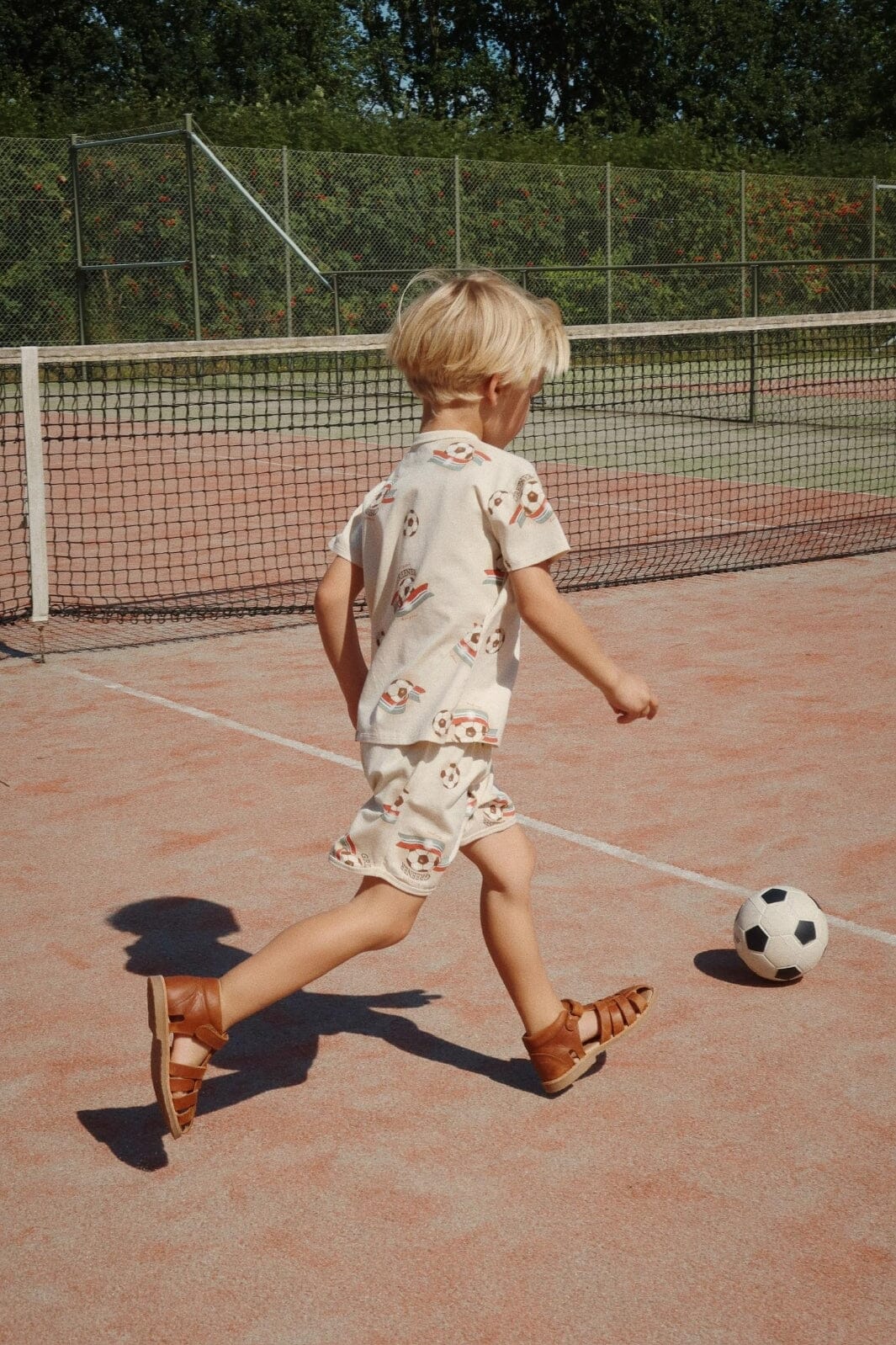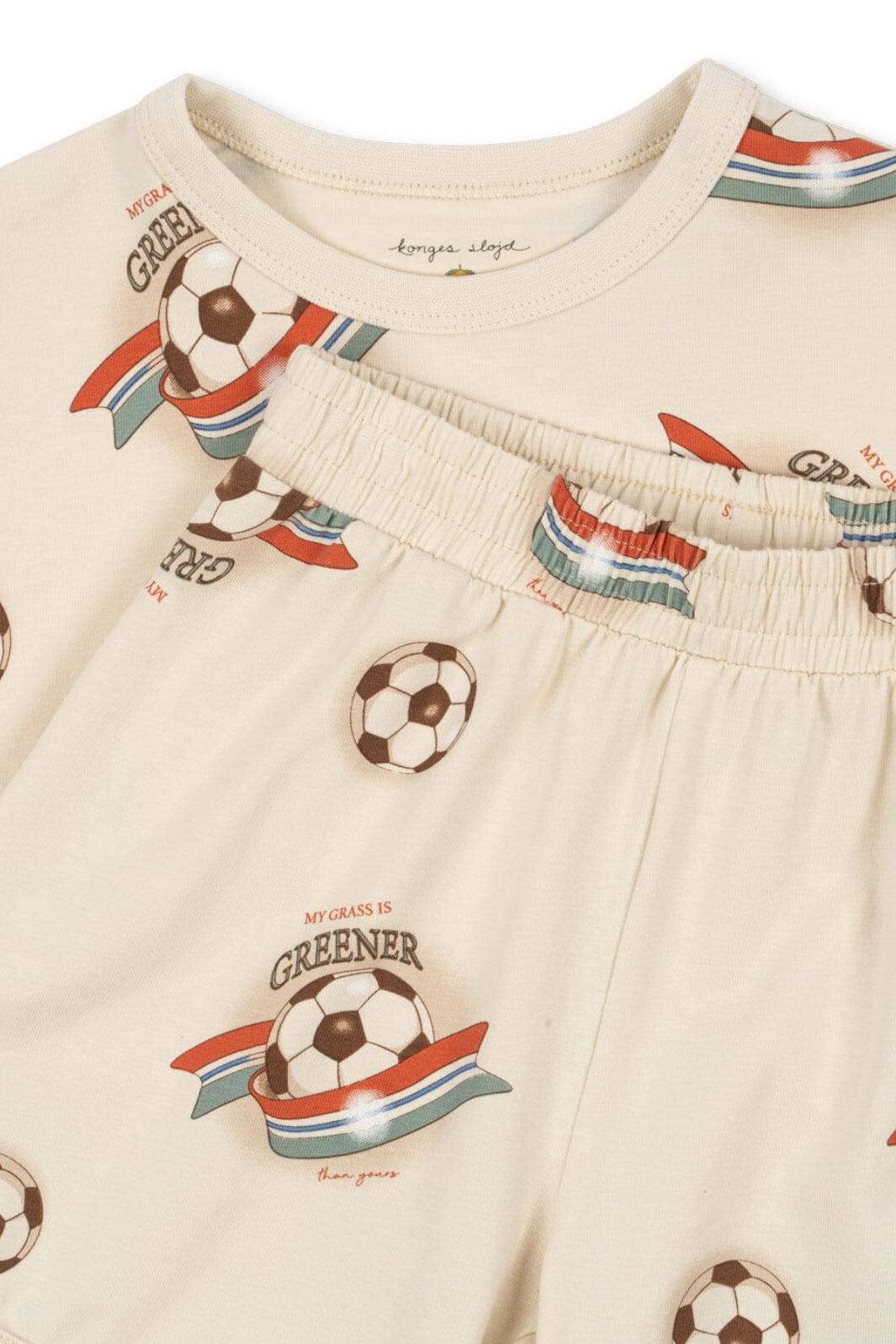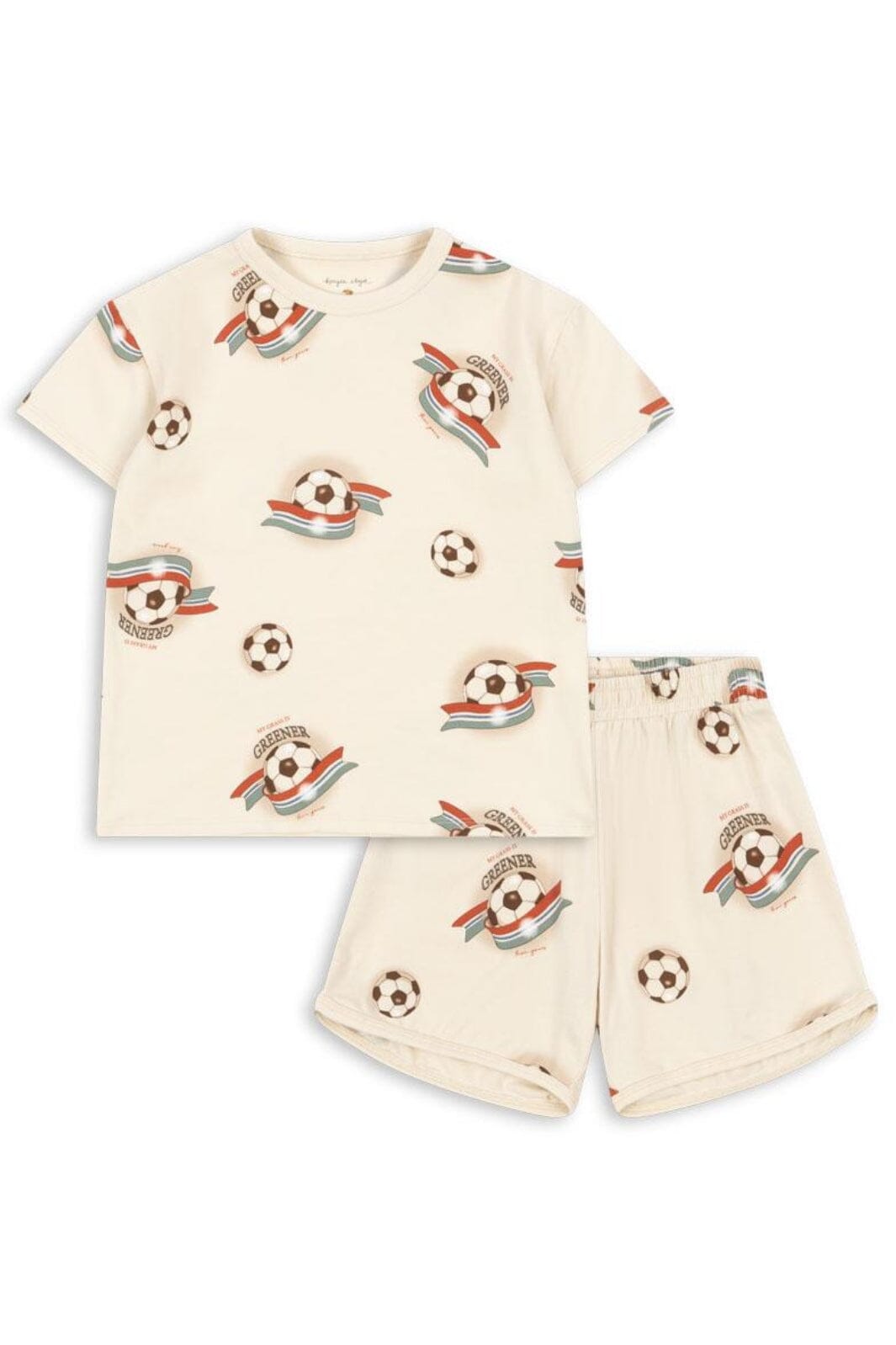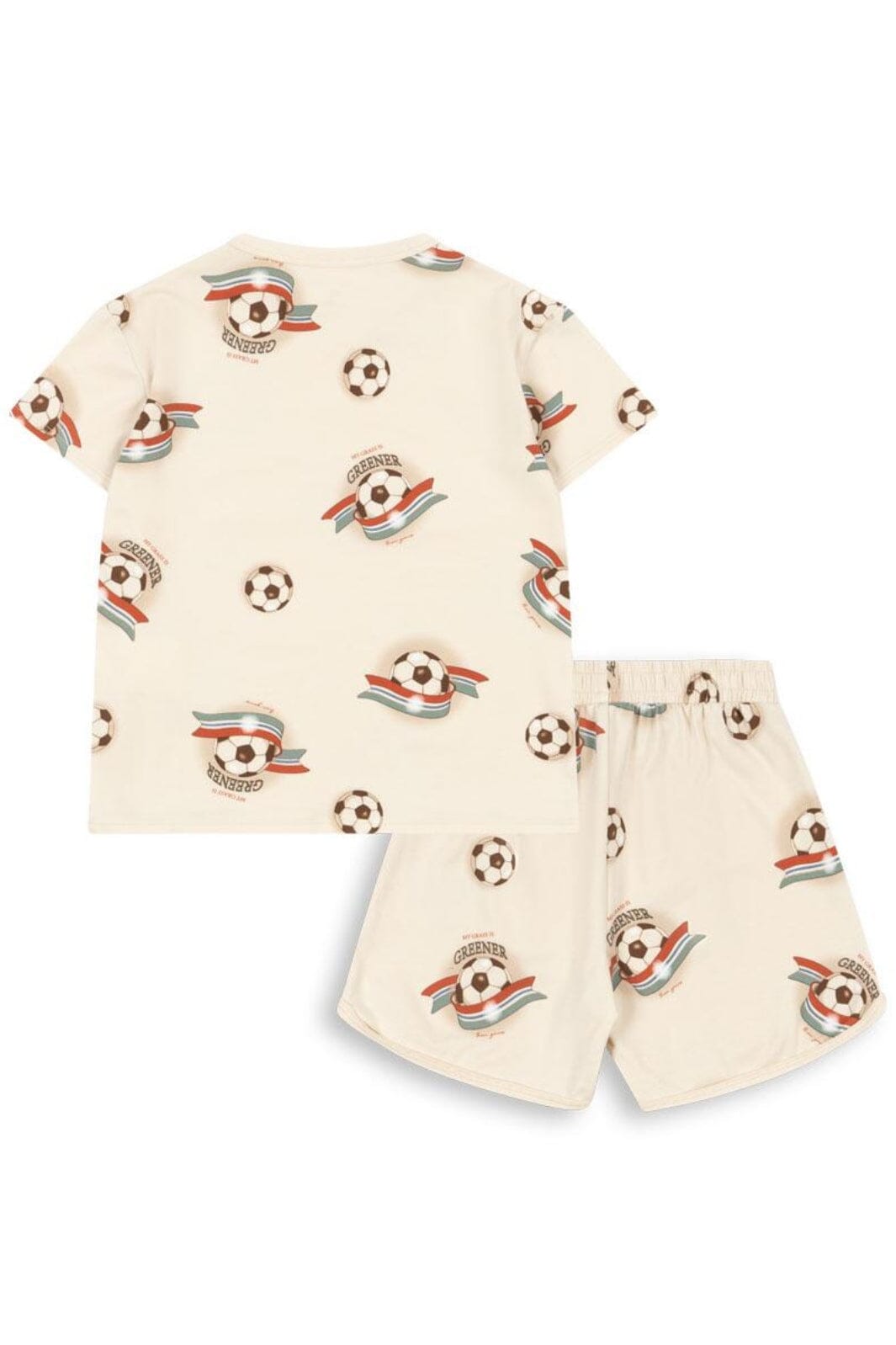 GOTS-zertifiziertes Set von Konges Sløjd mit T-Shirt und Shorts auf hellem Hintergrund. Das Set hat einen Fußballdruck und den Text MY GRASS IS GREENER sowie farbige Details.