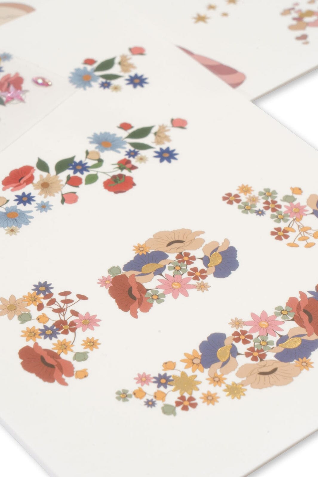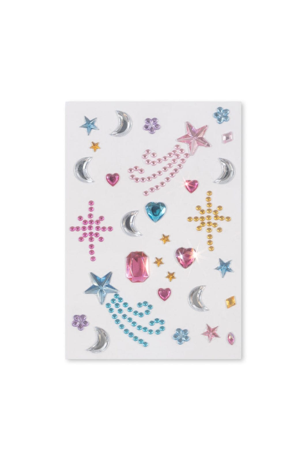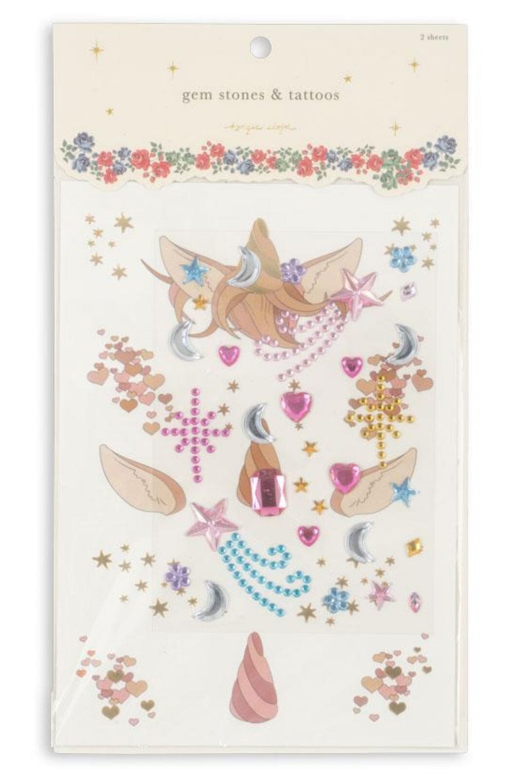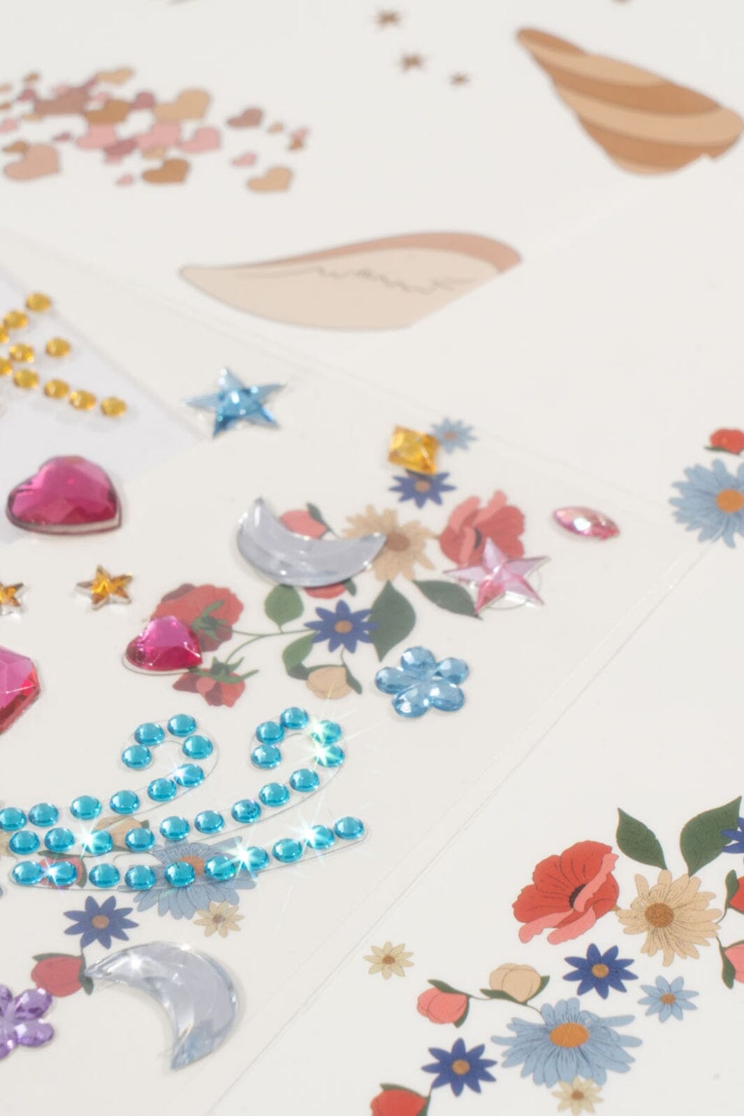 Die verschiedenen Motive auf den Bögen umfassen funkelnde Edelsteine und dekorative Tattoos mit Blumen und Sternen für kreatives Spielen.