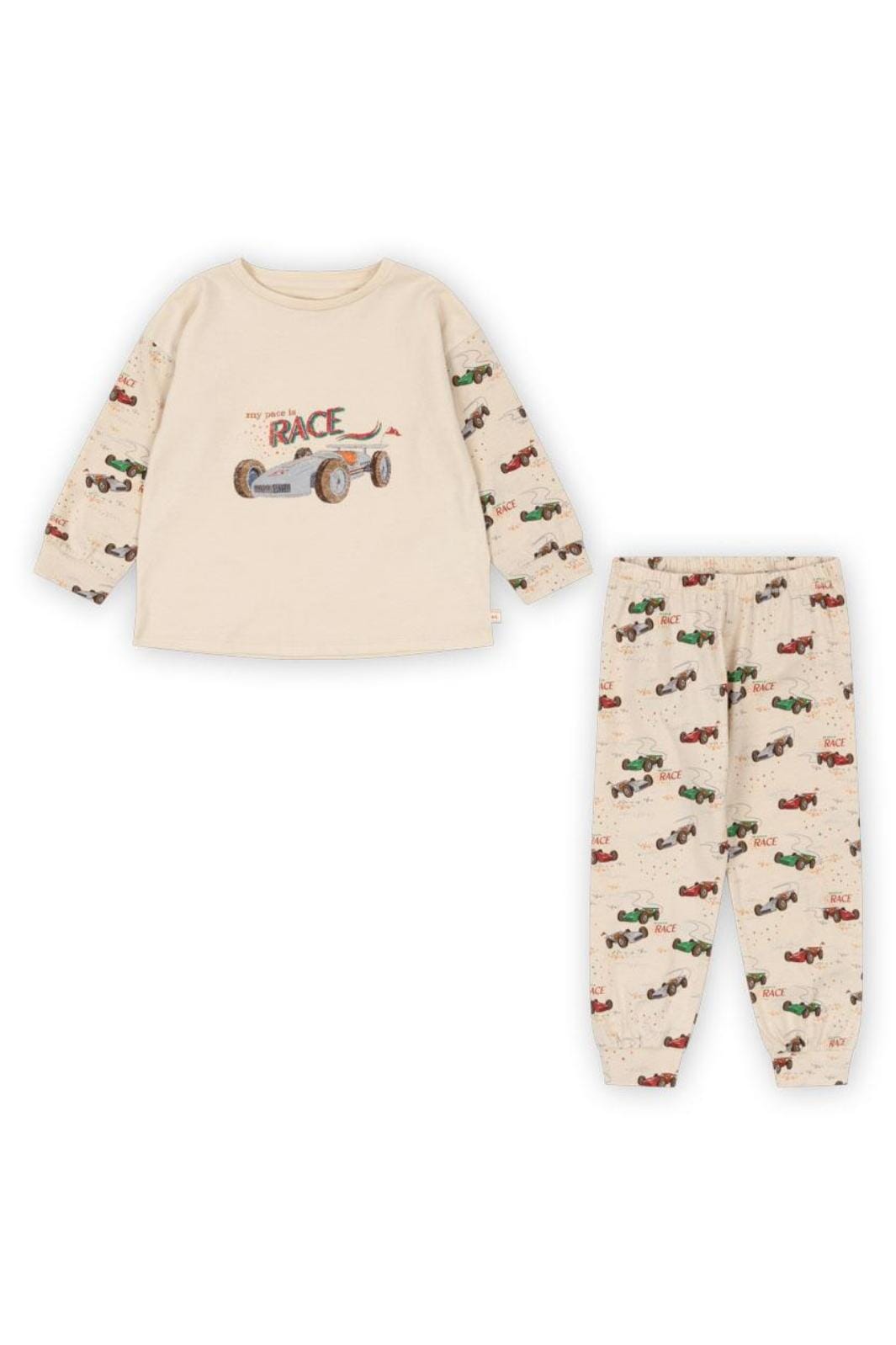 Ein Nachtwäsche-Set in hellbeige von Konges Sløjd mit Rennwagenmotiv. Das Oberteil hat ein großes Rennauto auf der Vorderseite mit dem Text My pace is RACE, während die Hose ein durchgehendes Rennwagenmuster hat.