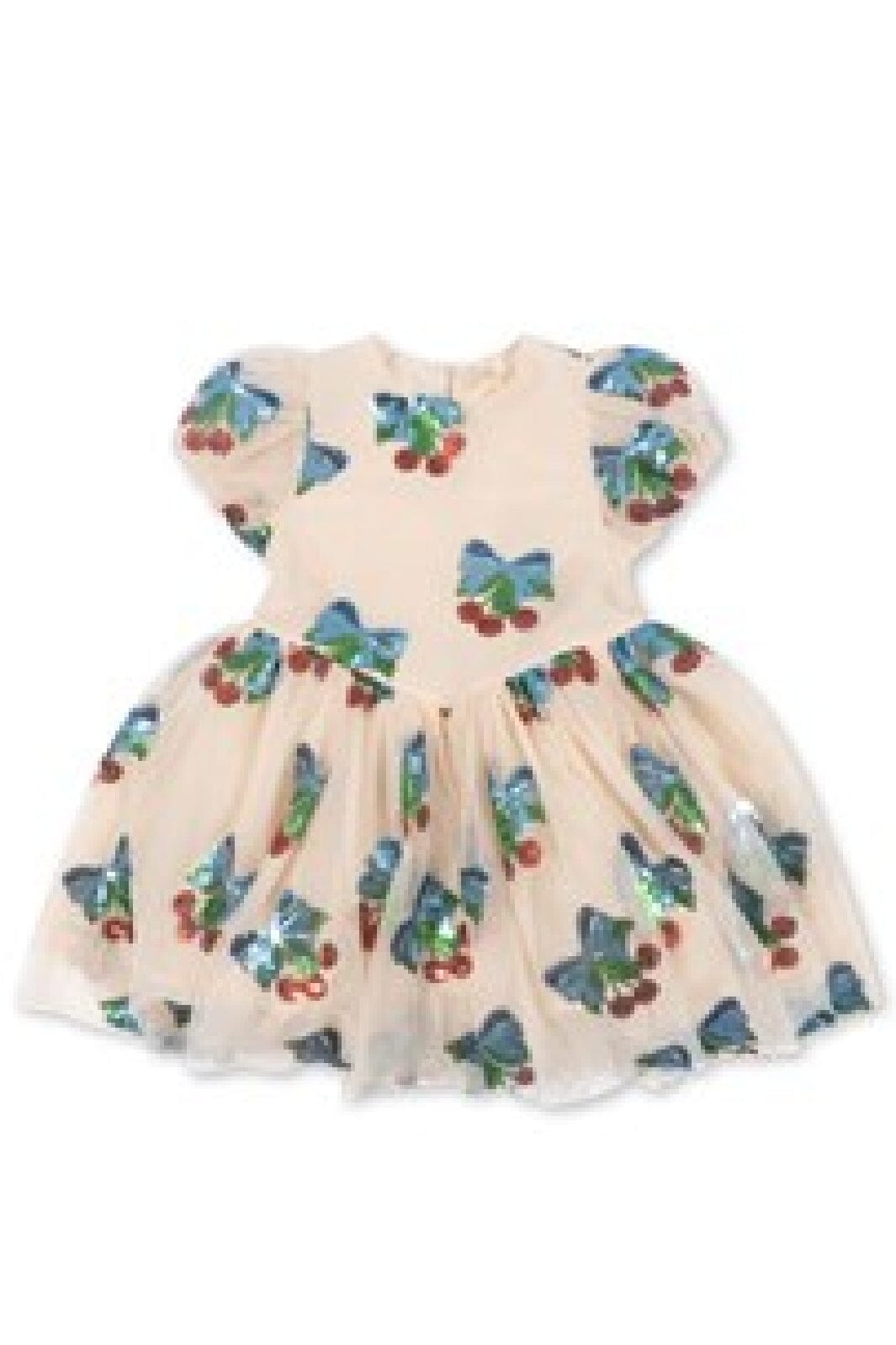 Ein Kleid von Konges Sløjd mit Pailletten in Schmetterlings- und Kirschmotiven auf weißem Hintergrund. Die puffigen Ärmel und der runde Ausschnitt verleihen dem Kleid einen verspielten Ausdruck.