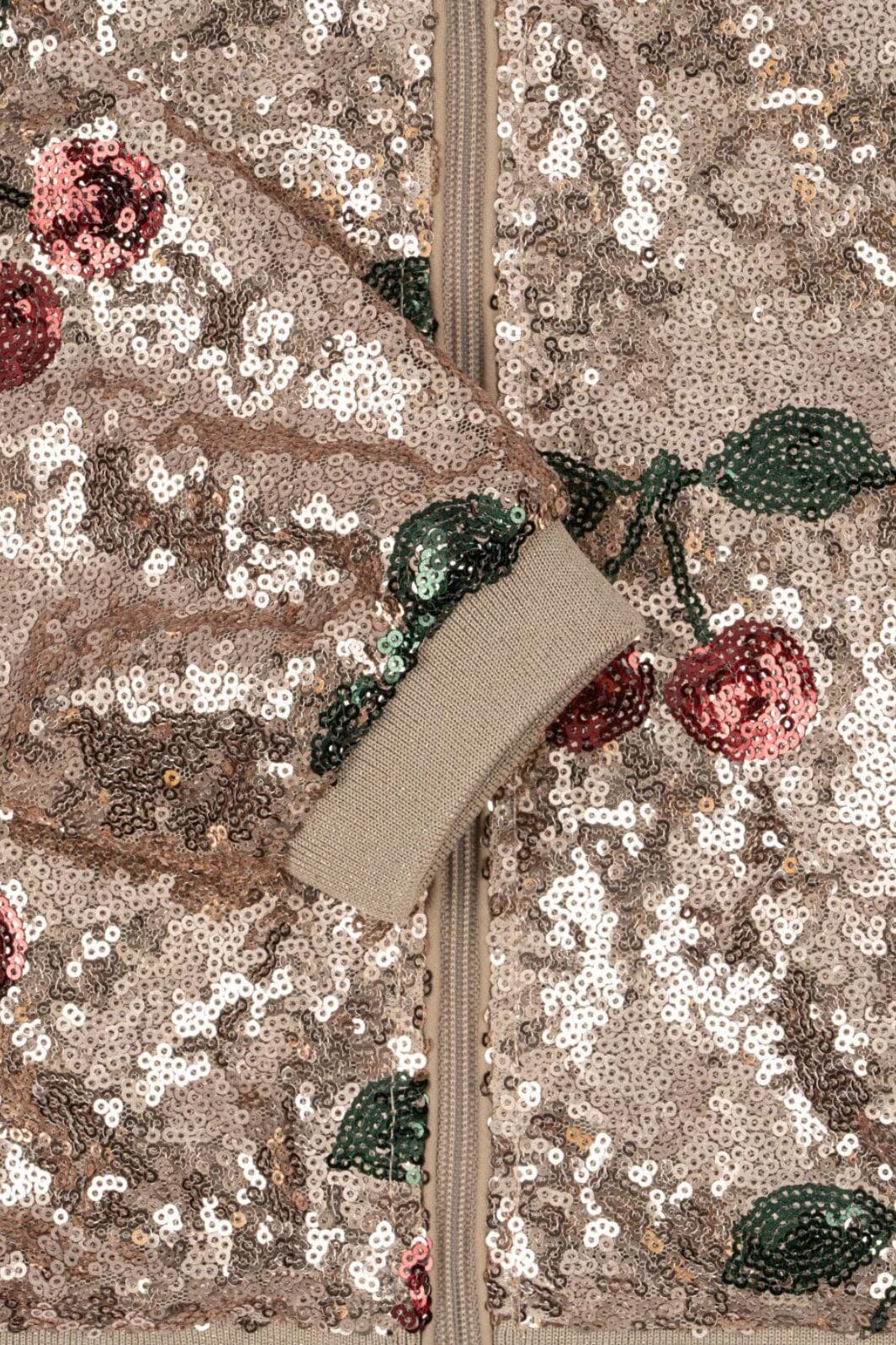 Paillettenjacke von Konges Sløjd mit glitzernden Pailletten und bestickten Kirschen in Beige und Gold. Die Jacke hat lange Ärmel und Rippstrickbündchen am Hals, an den Ärmeln und an der Taille.