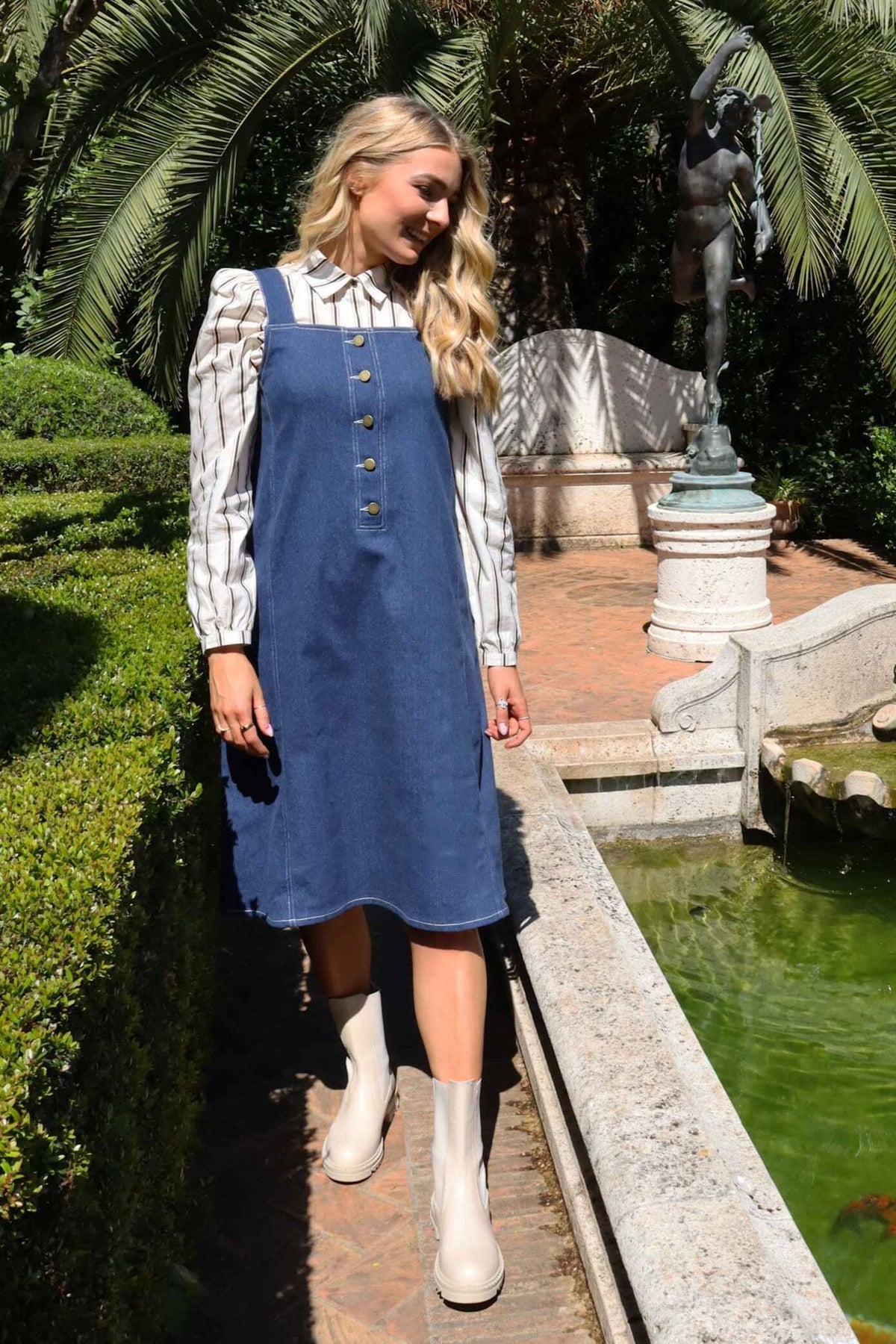 Denim-Overall von Liberte in klassischem Blau. Sie hat breite Träger und eine Knopfleiste vorne mit dekorativen Nähten entlang der Kanten.