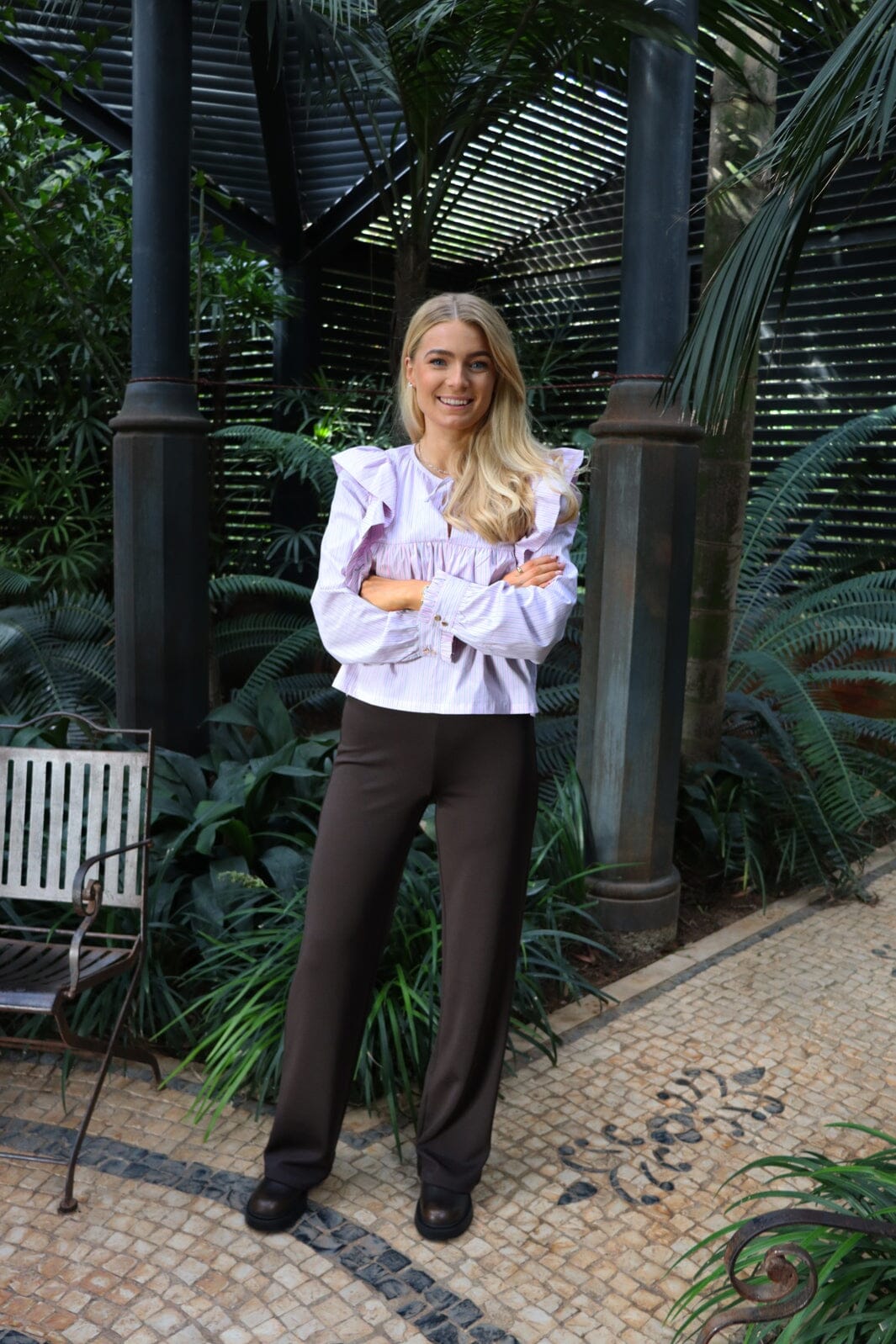 Rosa gestreifte Bluse von Liberte, aus 100 % Baumwolle gefertigt. Die Bluse hat ein rosa und weißes Streifenmuster mit Rüschen an den Schultern.