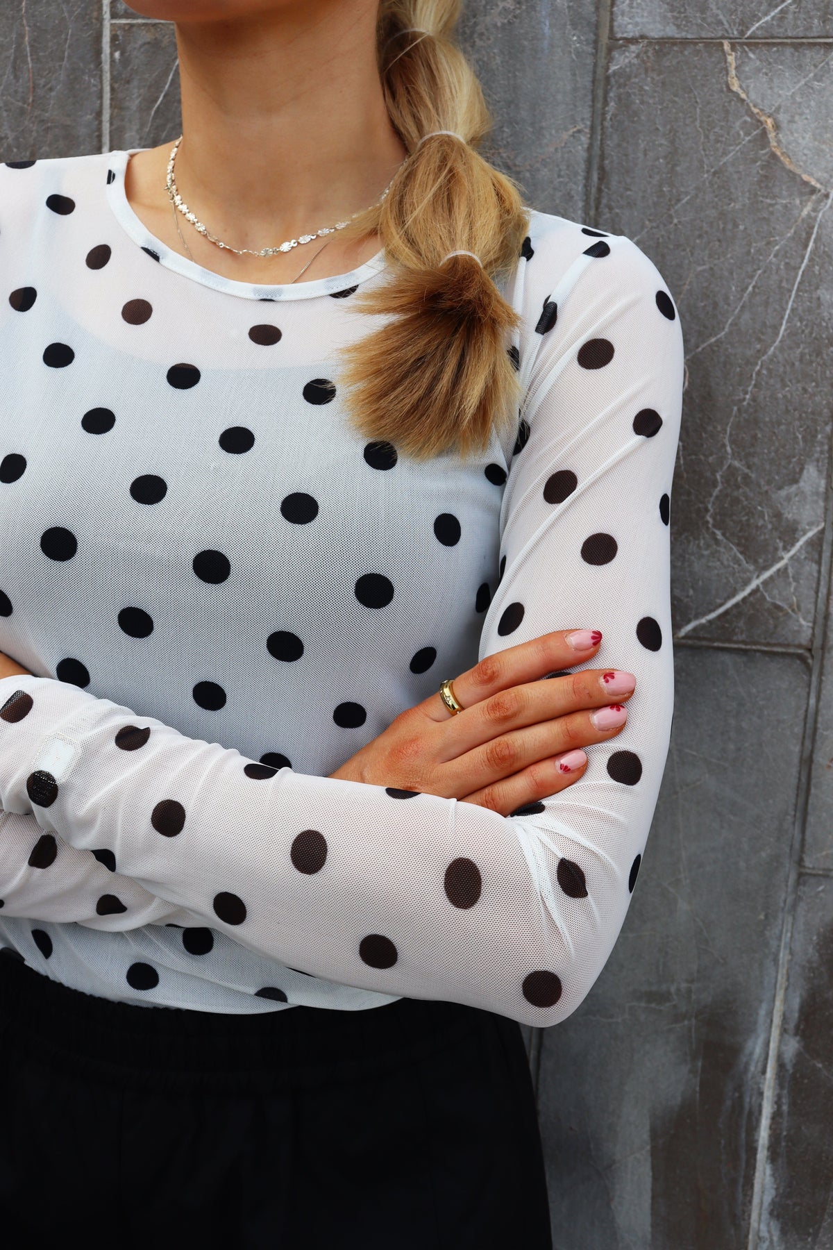 Ein Mesh-T-Shirt von Liberte mit langen Ärmeln. Die weiße Basis hat große schwarze Punkte in einem Polka-Dot-Muster.