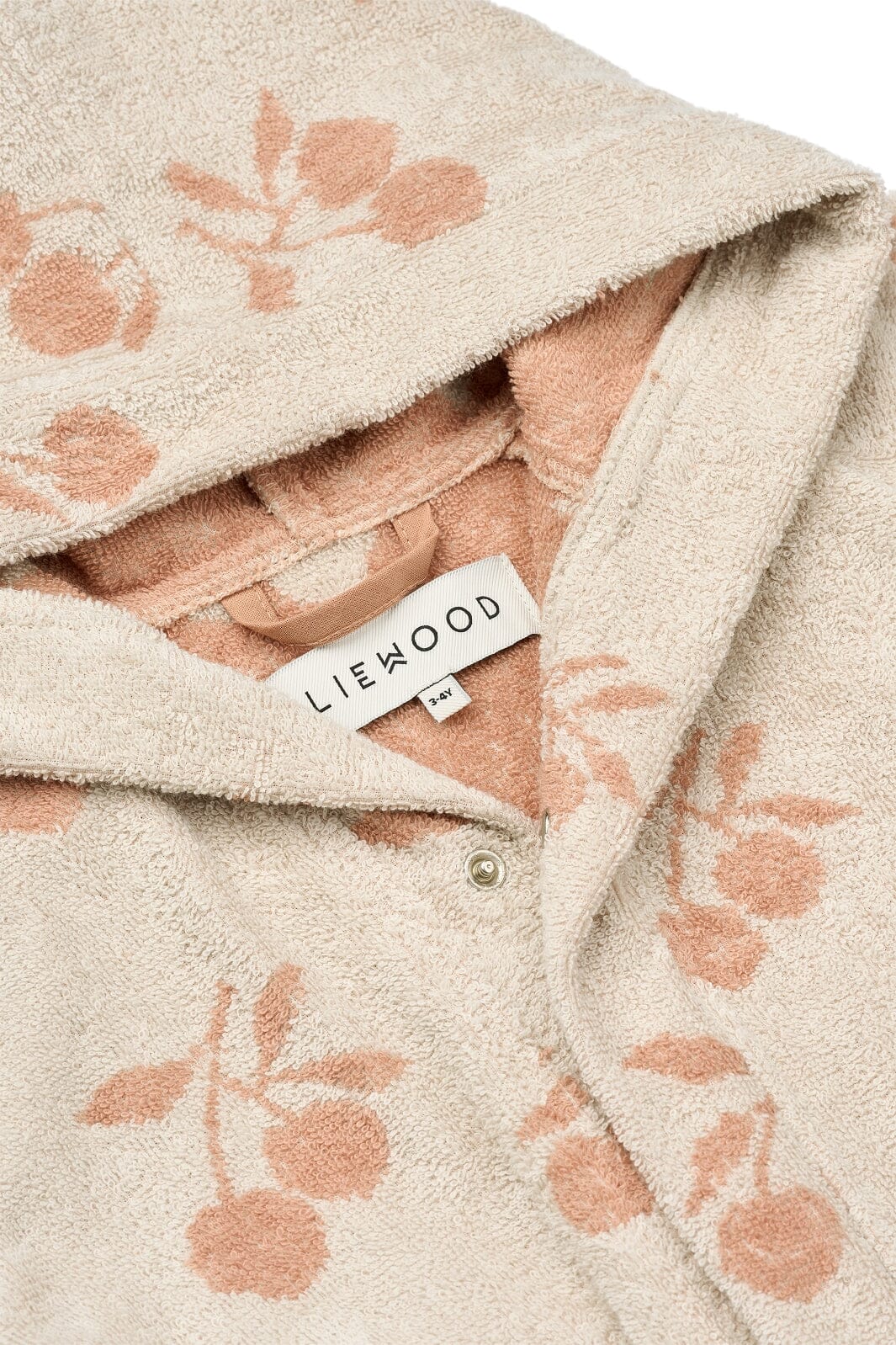 Bademantel von Liewood in den Farben Pfirsich und Muschelweiß. Sie besteht aus Bio-Baumwolle mit einem Blumenmuster und hat eine Kapuze sowie einen Gürtel in der Taille.