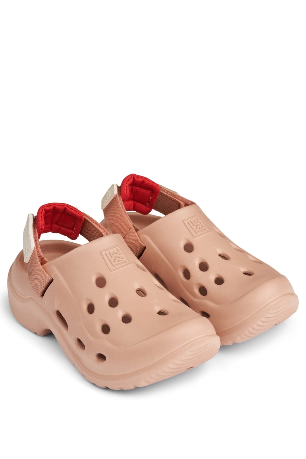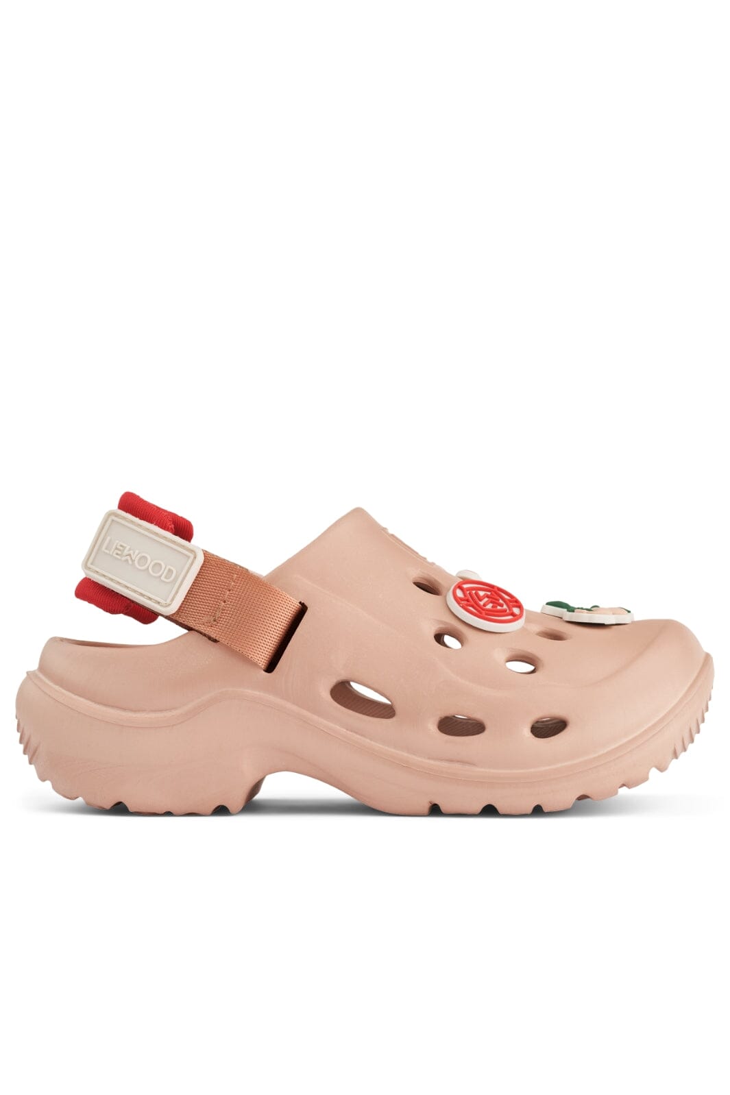 Sandalen von Liewood aus beigem EVA-Material mit watermelonfarbigen Details. Die Sandalen haben kleine süße Charms und Belüftungslöcher an den Seiten.