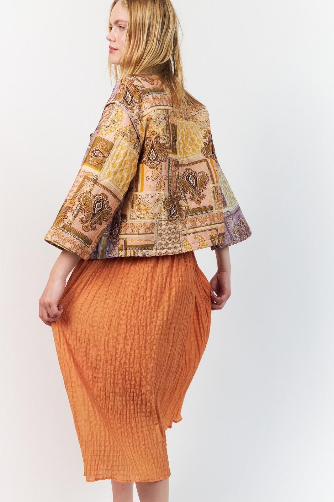 Eine Jacke von Lollys Laundry mit einem bunten Patchwork-Design in Paisley- und geometrischen Mustern. Die Jacke hat 3/4-Ärmel und eine lockere Passform.