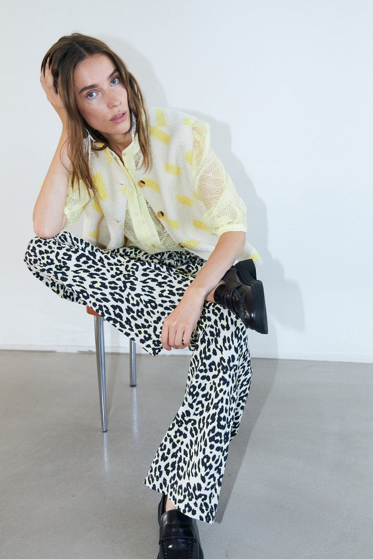 Ärmellose Weste von Lollys Laundry mit einem geometrischen Muster aus gelben Rechtecken auf cremefarbigem Hintergrund. Sie hat einen runden Halsausschnitt und Knöpfe vorne.