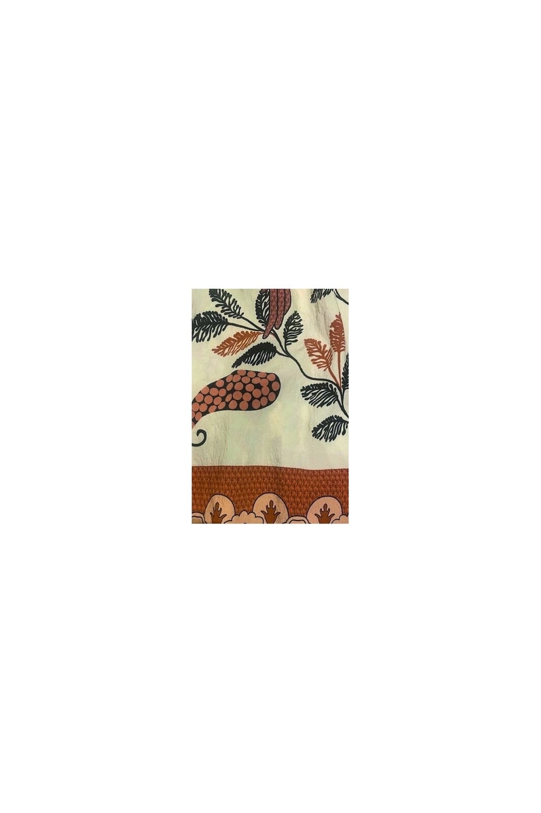 Maxikleid von Lollys Laundry in Creme mit einem botanischen Muster. Das Kleid kombiniert Punkte und Blumen in Nuancen von Orange und Schwarz und hat 3/4 Ärmel.