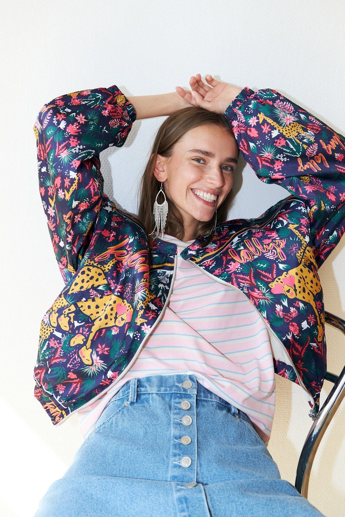 Jacke von Lollys Laundry mit buntem Druck von Leoparden und Blumen. Das cropped Modell hat einen Reißverschluss vorne und elastische Manschetten an den Ärmeln.