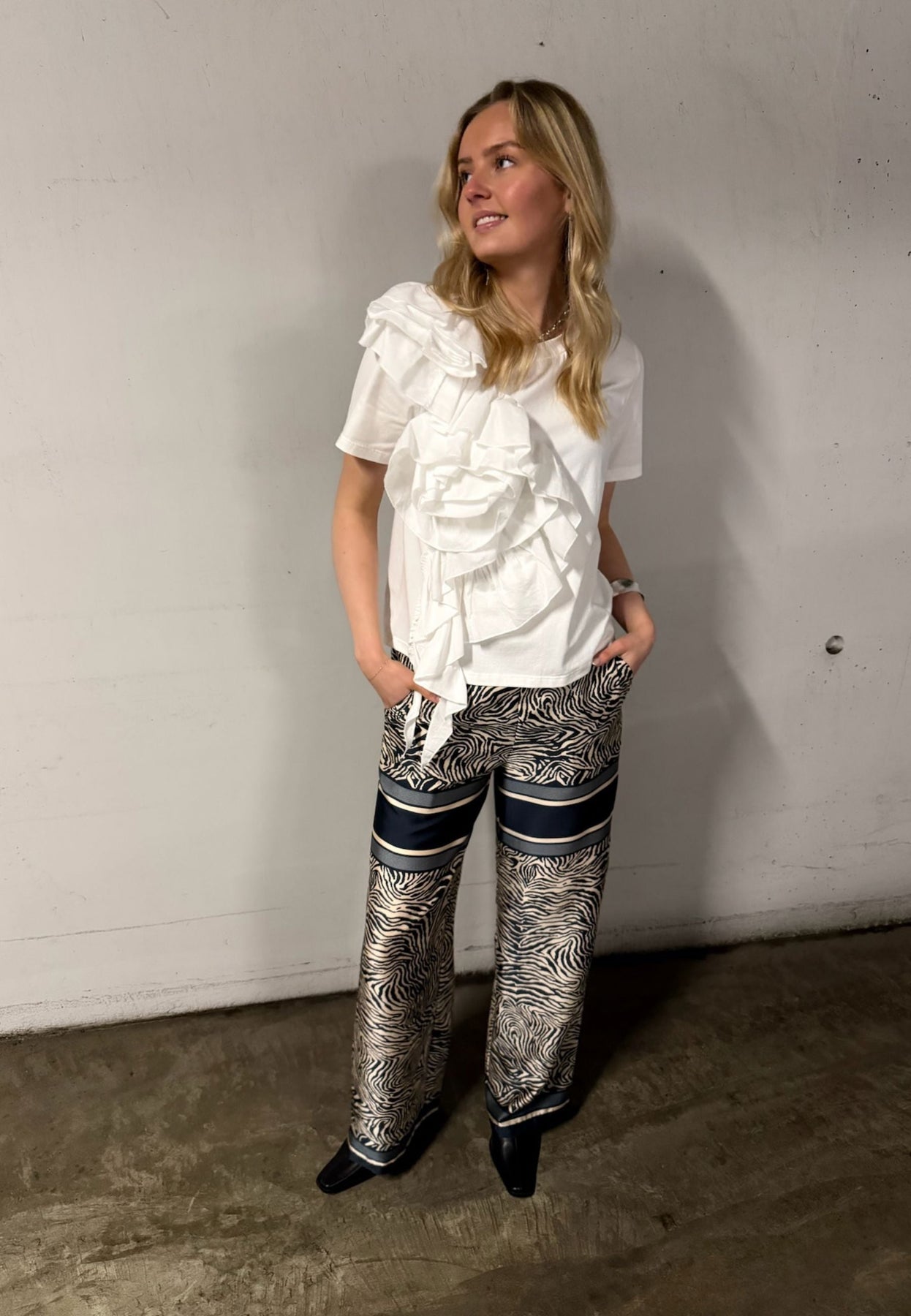 Hose von Love & Divine mit einem Zebramuster in Dunkelblau und Beige. Die Hose hat breite dunkelblaue Streifen, die einen Kontrast zum Muster bilden.