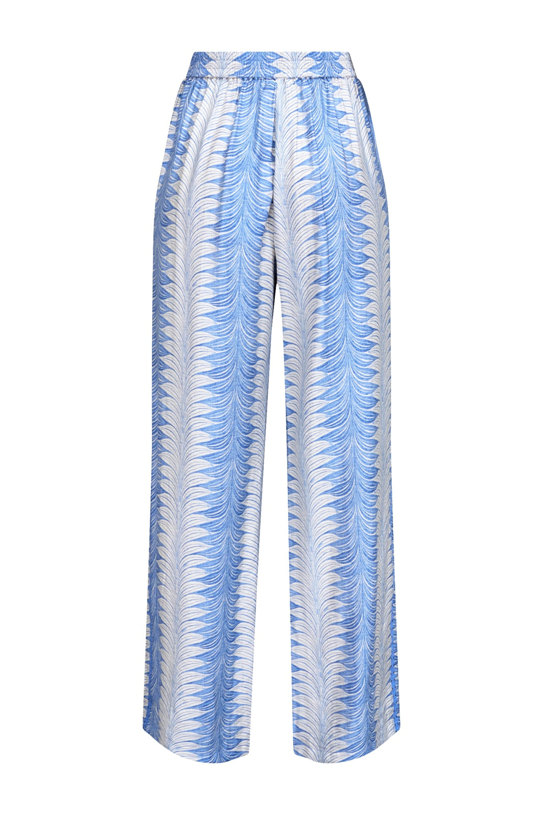 Weite Hose von Love & Divine mit einem ethnischen Print in Blau, Weiß und Creme. Die Hose hat eine bodenlange Länge und eine lockere Passform.