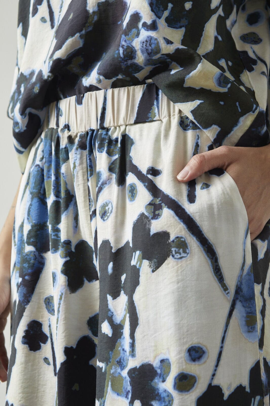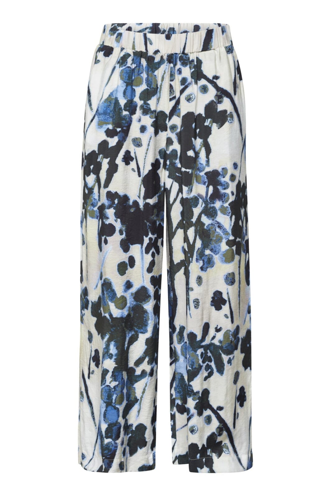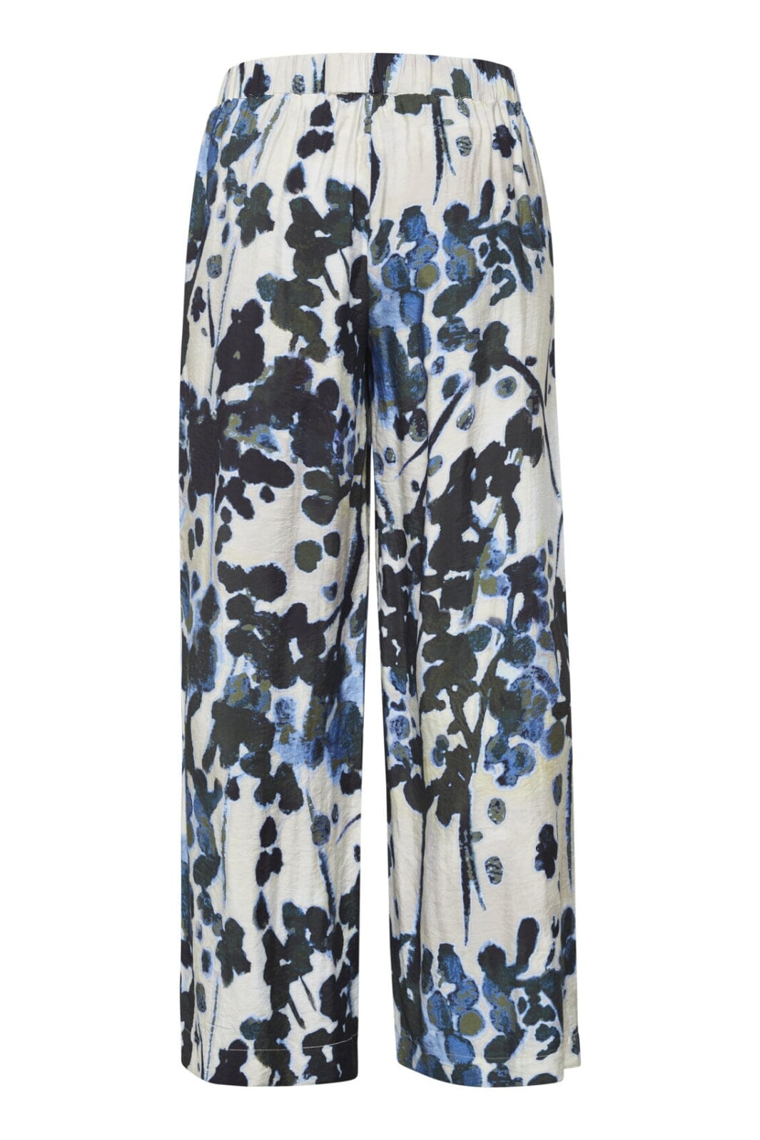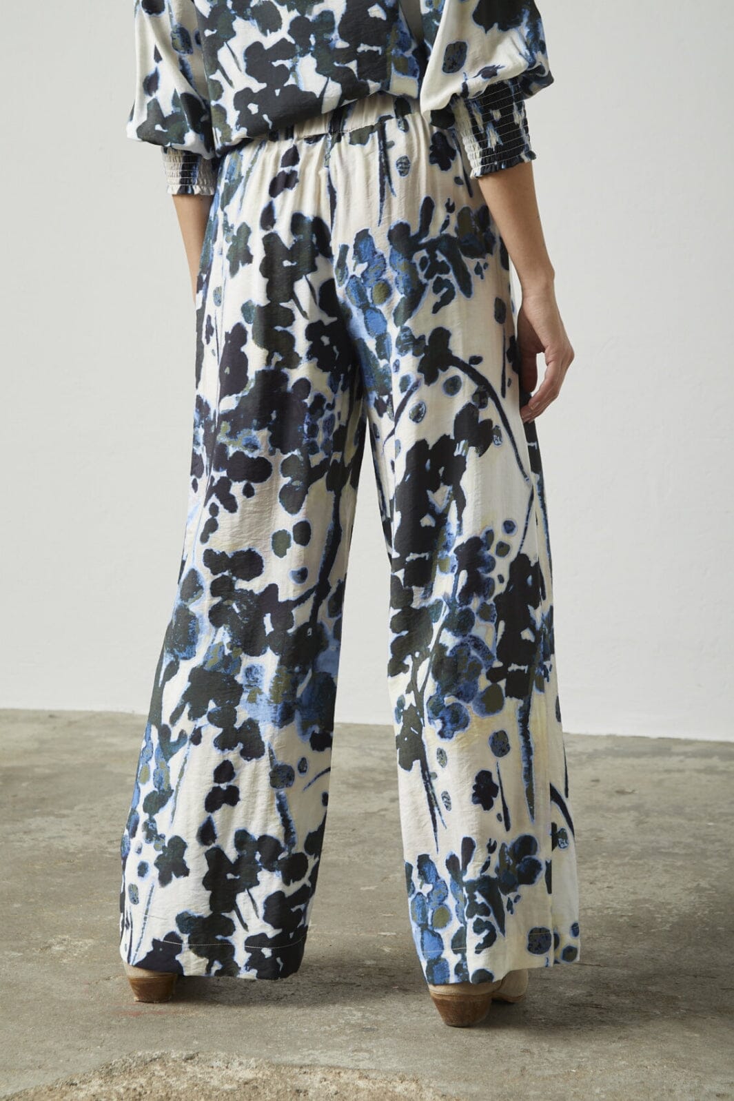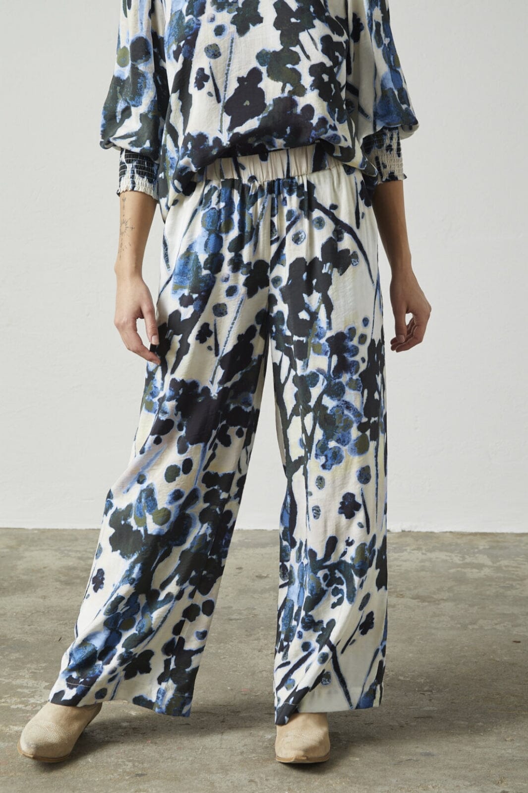 Hosen von Love & Divine mit floralem Muster in Blau, Schwarz und grünen Nuancen auf hellem Hintergrund. Die Hosen haben weite Beine und eine lockere Passform.