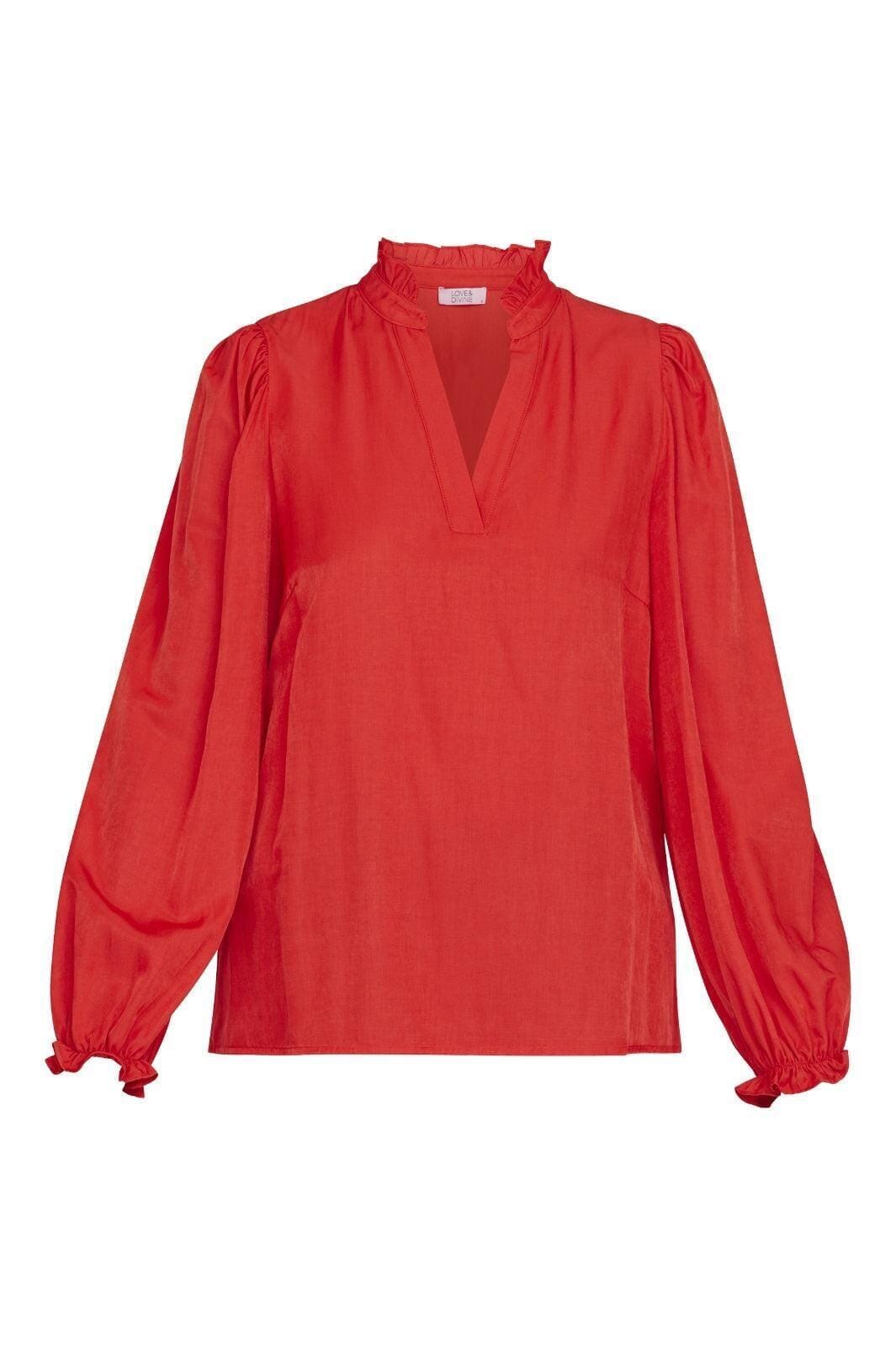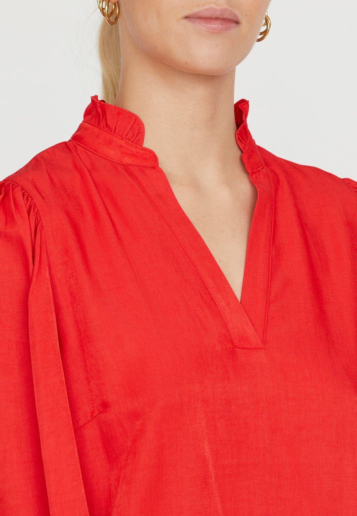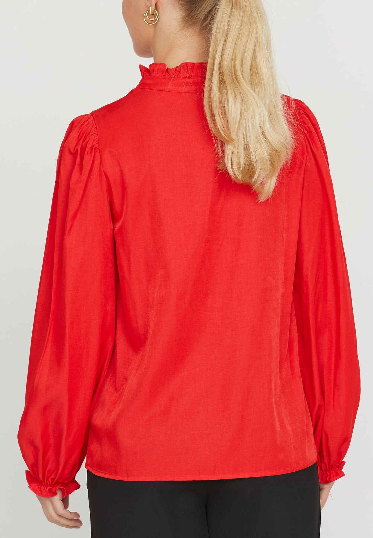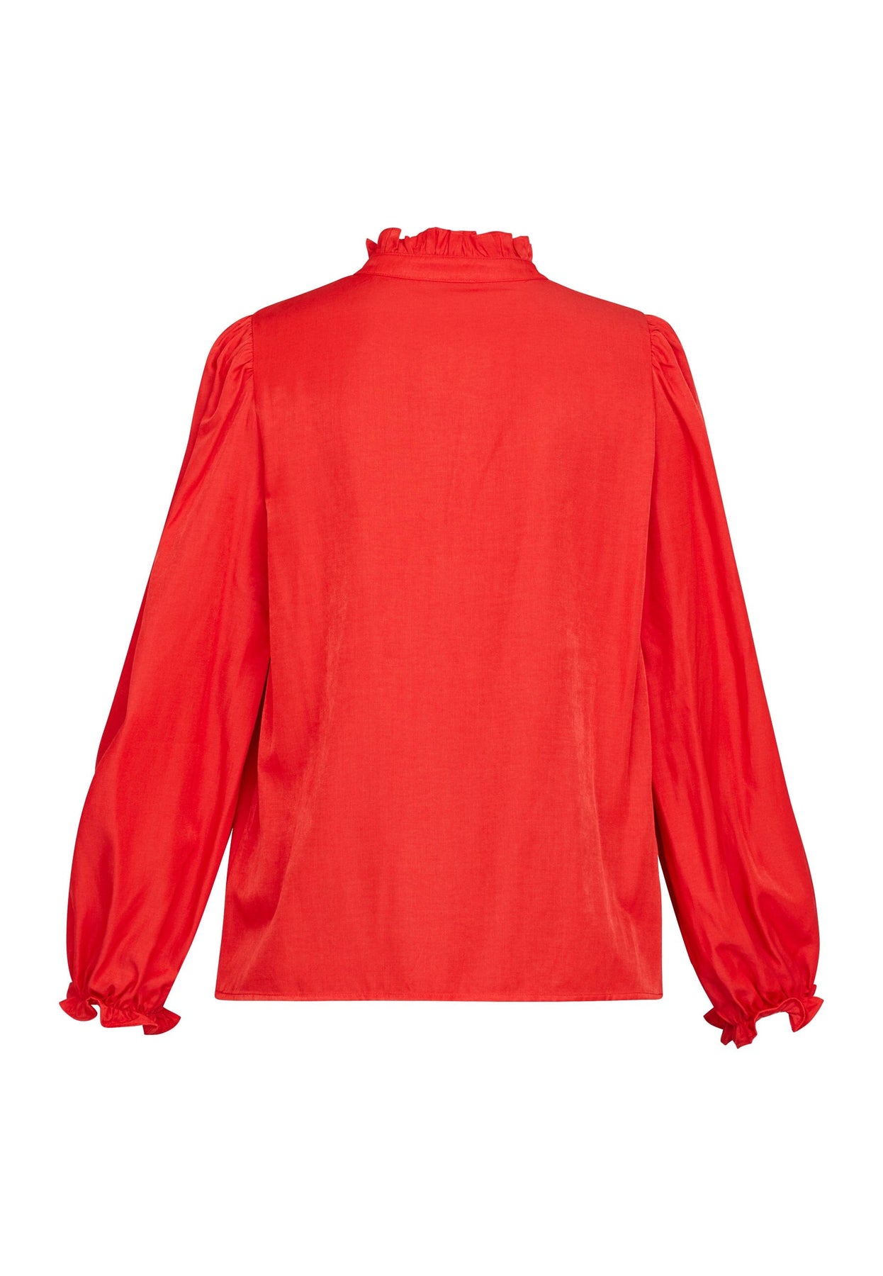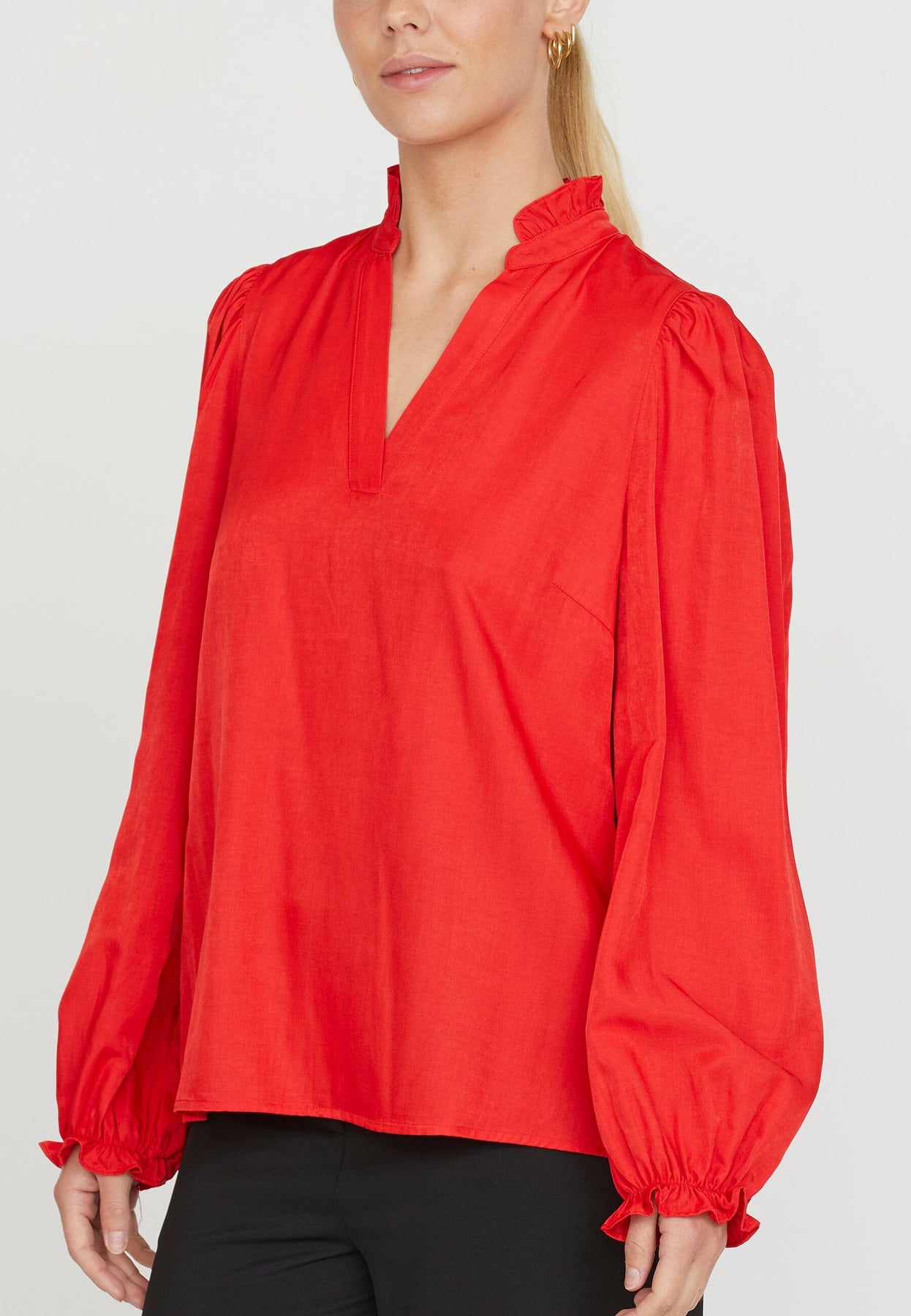 Rote Bluse von Love & Divine mit gerafftem Kragen und Puffärmeln. Die Bluse hat einen V-Ausschnitt und Rüschendetails an den Schultern, die einen femininen Ausdruck verleihen.