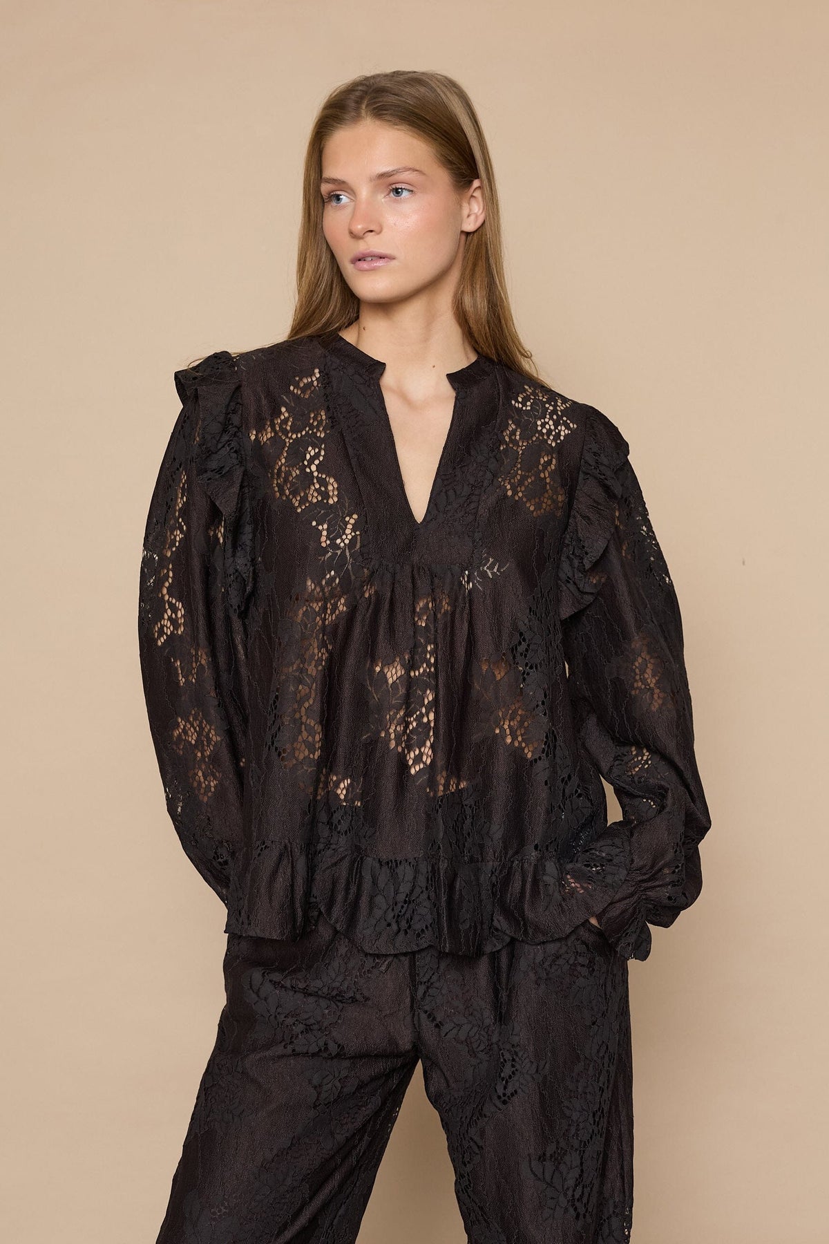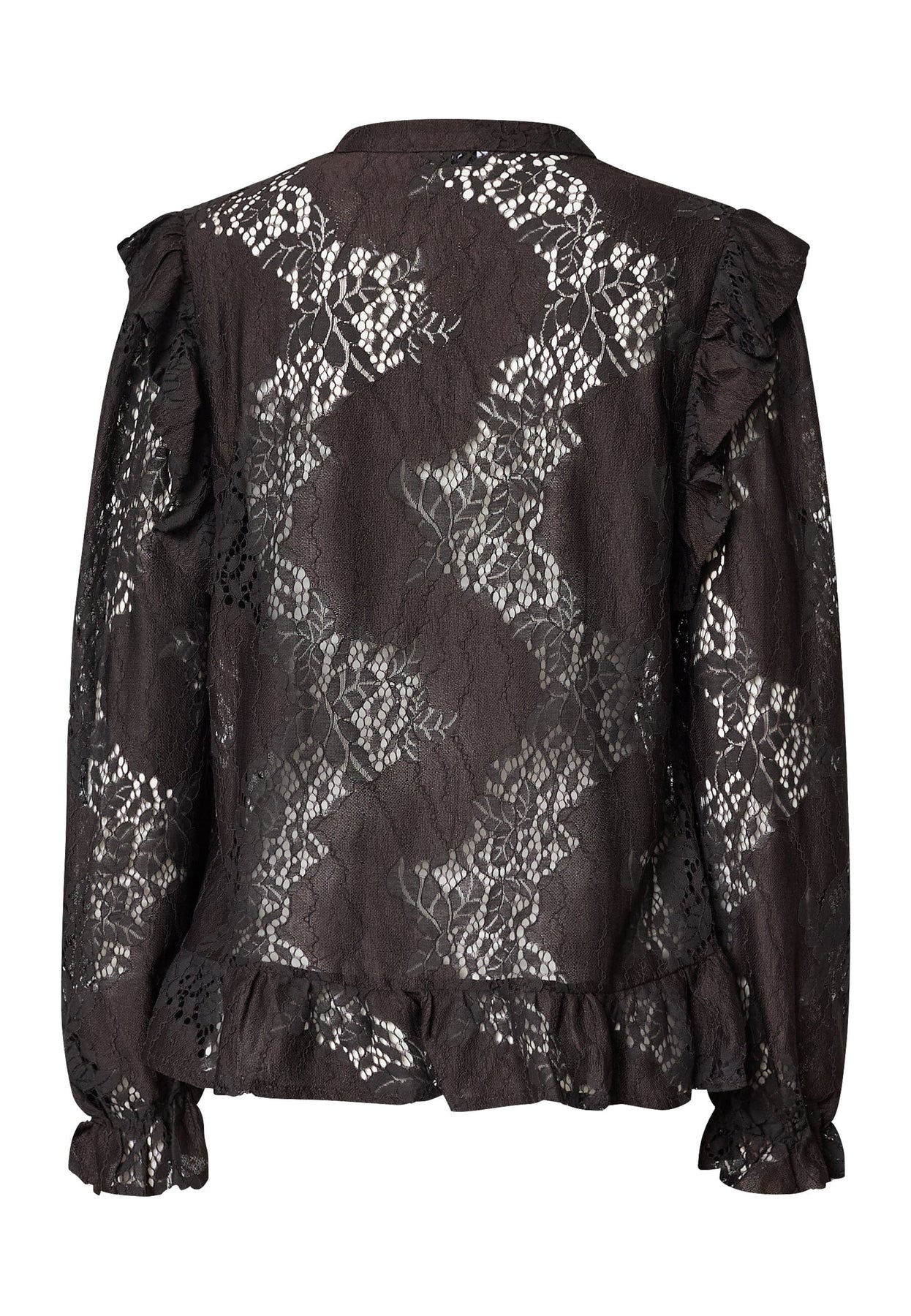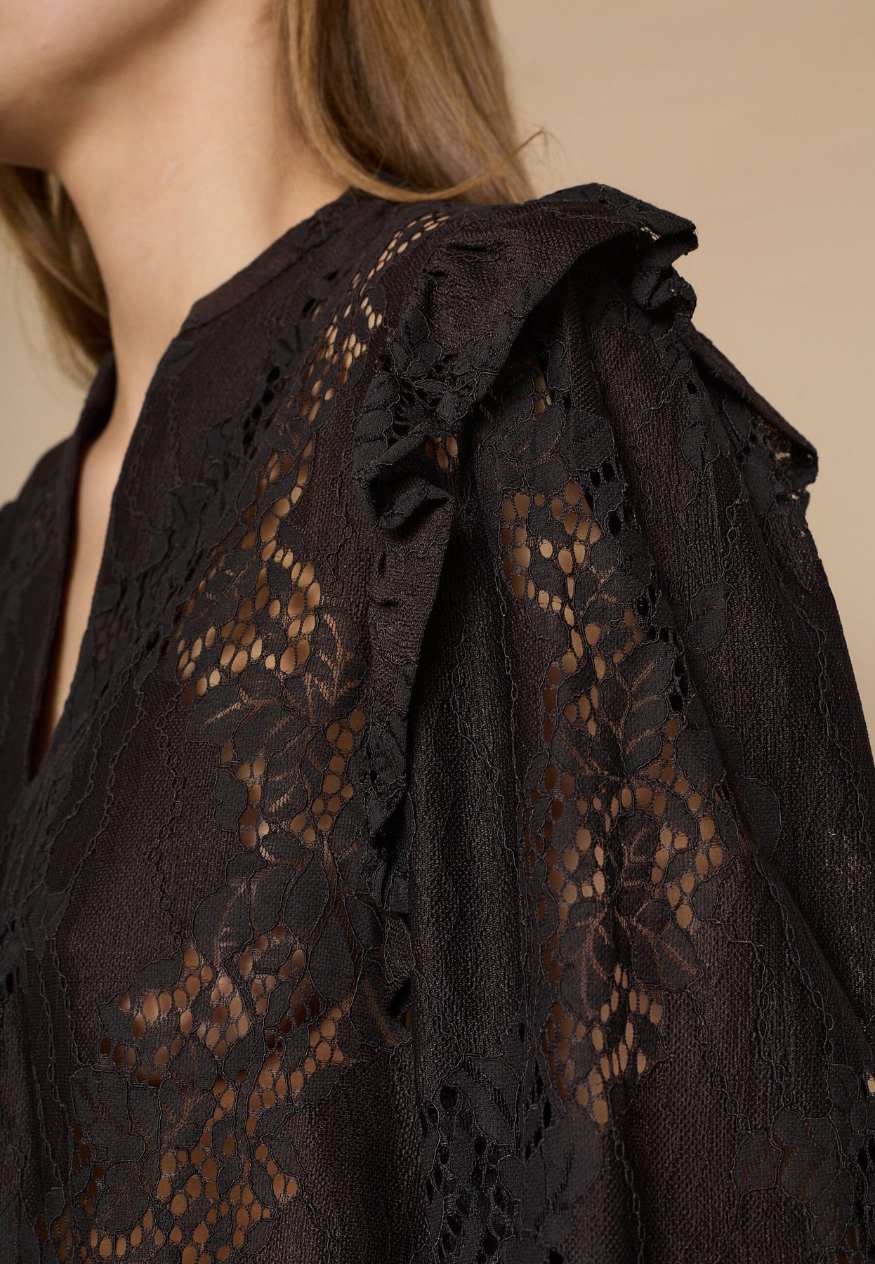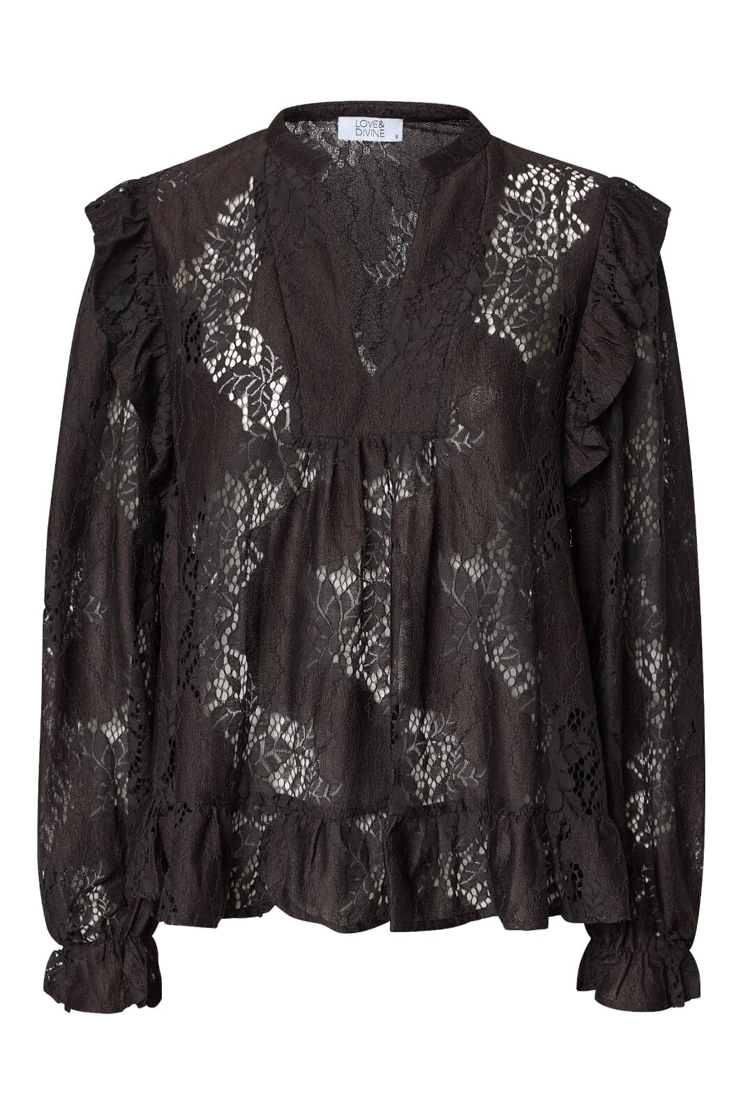 Bluse von Love & Divine in dunklem Schokoladenbraun mit transparentem, geblümtem Spitzendessin. Die Bluse hat Volantdétails an den Schultern und an den Manschetten.