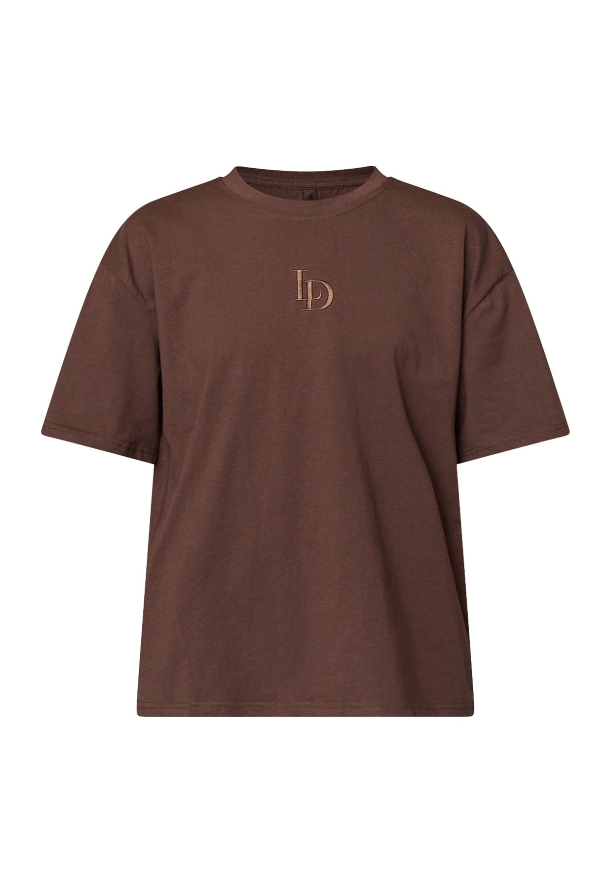 Braunes T-Shirt von Love & Divine aus 100 % Baumwolle. Das T-Shirt hat eine oversized Passform und Stickerei als Detail.