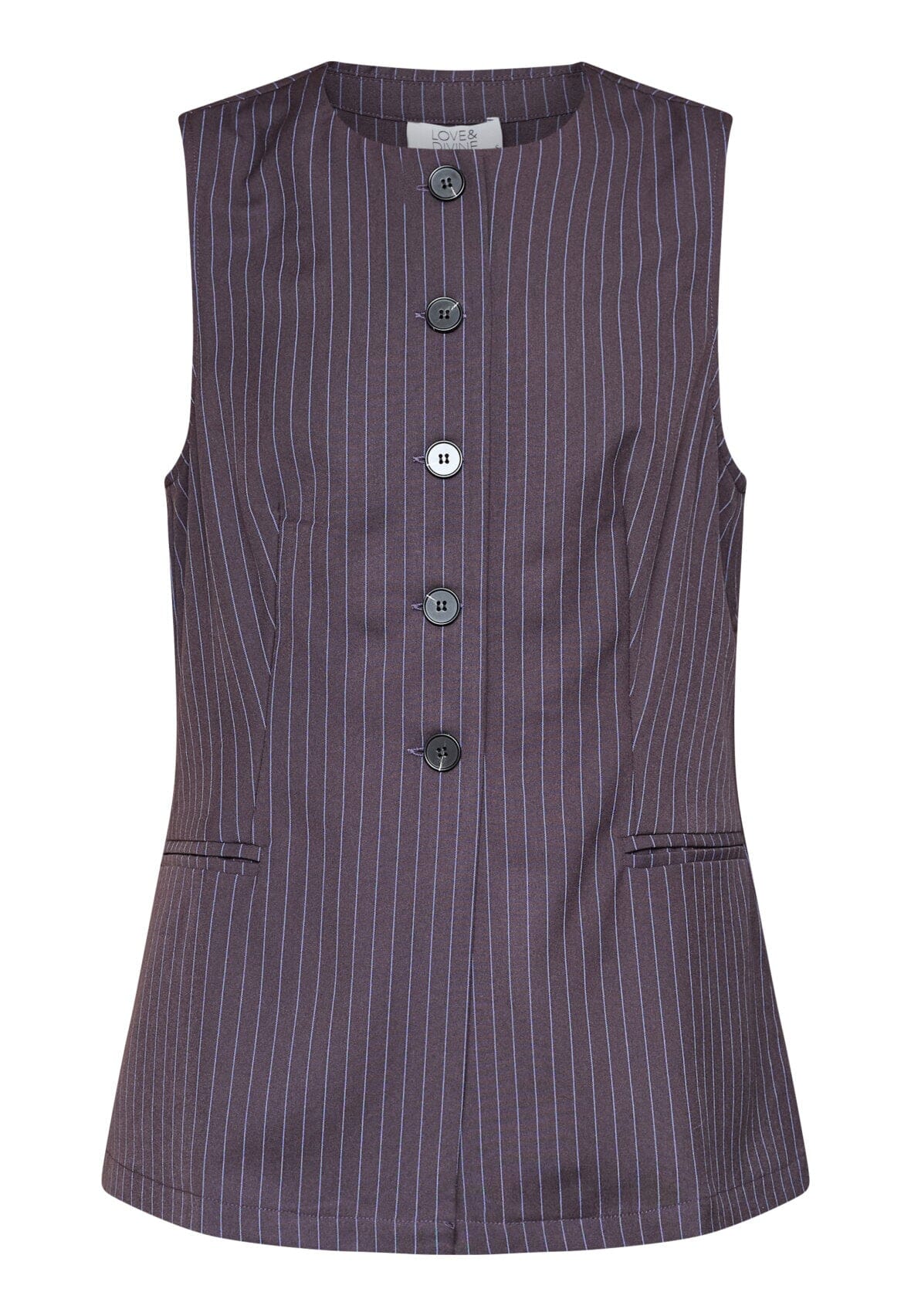 Ärmlose Weste von Love & Divine mit blauen Nadelstreifen. Die Weste eignet sich sowohl für formelle Meetings als auch für festliche Anlässe.